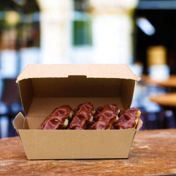 The #56 corrugated clamshell portion box is designed for serving individual portions. The pack contains 4 sleeves, with 50 boxes per sleeve. It offers a convenient and hygienic solution for portioning and packaging various food items. Made from durable corrugated material, this clamshell container ensures reliable protection and freshness for a variety of food items. Its design is perfect for restaurants, catering services, and takeout. 493458 belgian waffles, chicken portion box, goujons box, chips, meal box, tender box, loaded fries, brownies