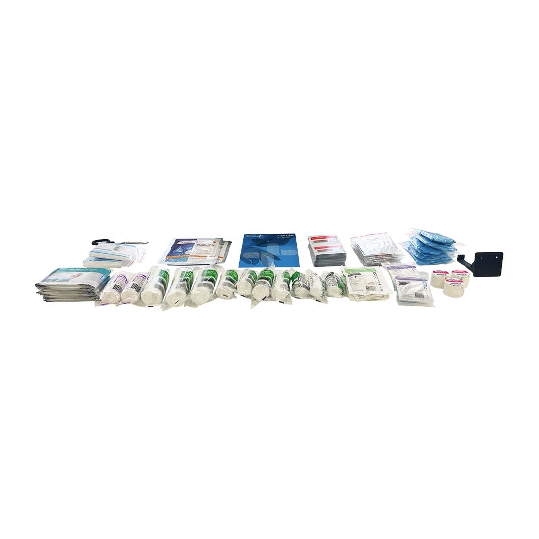 Contents: 1 x Aero A6 first aid leaflet, 8 x AeroWound HSE medium dressings (12 x 12cm), 2 x AeroWound HSE large dressings (18 x 18cm), 4 x AeroBand non-woven tri-bandages (90 x 90 x 127cm), 4 x AeroWound HSE eye pads, 2 x AeroBurn sterile gel dressings (10 x 10cm), 10 x 10 AeroPlast assorted washproof plasters, 3 x AeroPlast emergency foil blankets (140 x 210cm), AeroGlove 12 x pairs of large powder-free nitrile gloves, 1 x AeroPore tape (2.5cm x 10m), 4 x AeroWound finger dressings, 2 x AeroForm bandages (7.5cm x 4m), 40 x AeroWipe saline cleansing wipes, 12 x 2 AeroPin nickel-plated safety pins (three sizes), 1 x pair of Aero Tuffcut scissors (7.5" x 190mm) and 2 x AeroShield CPR face shields.