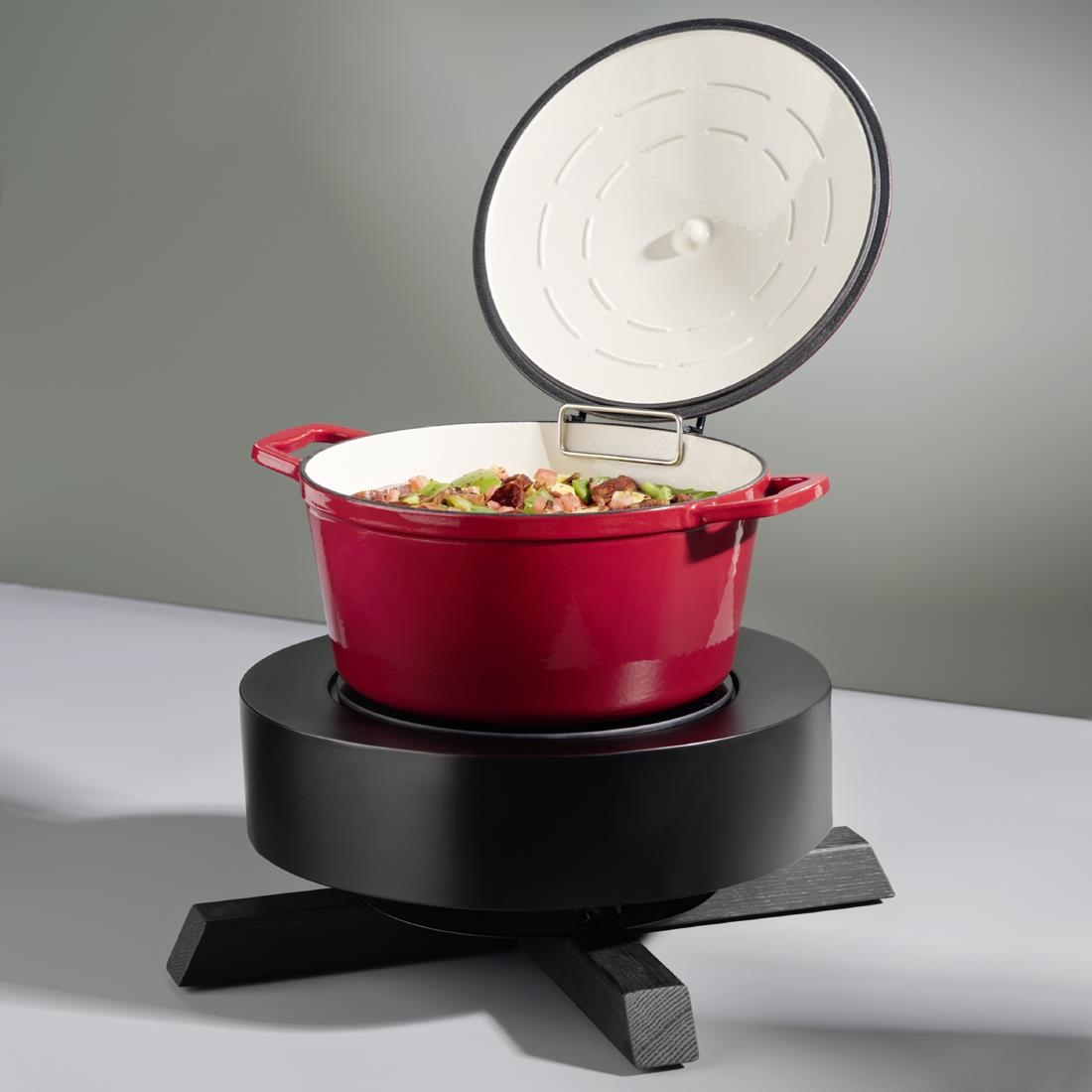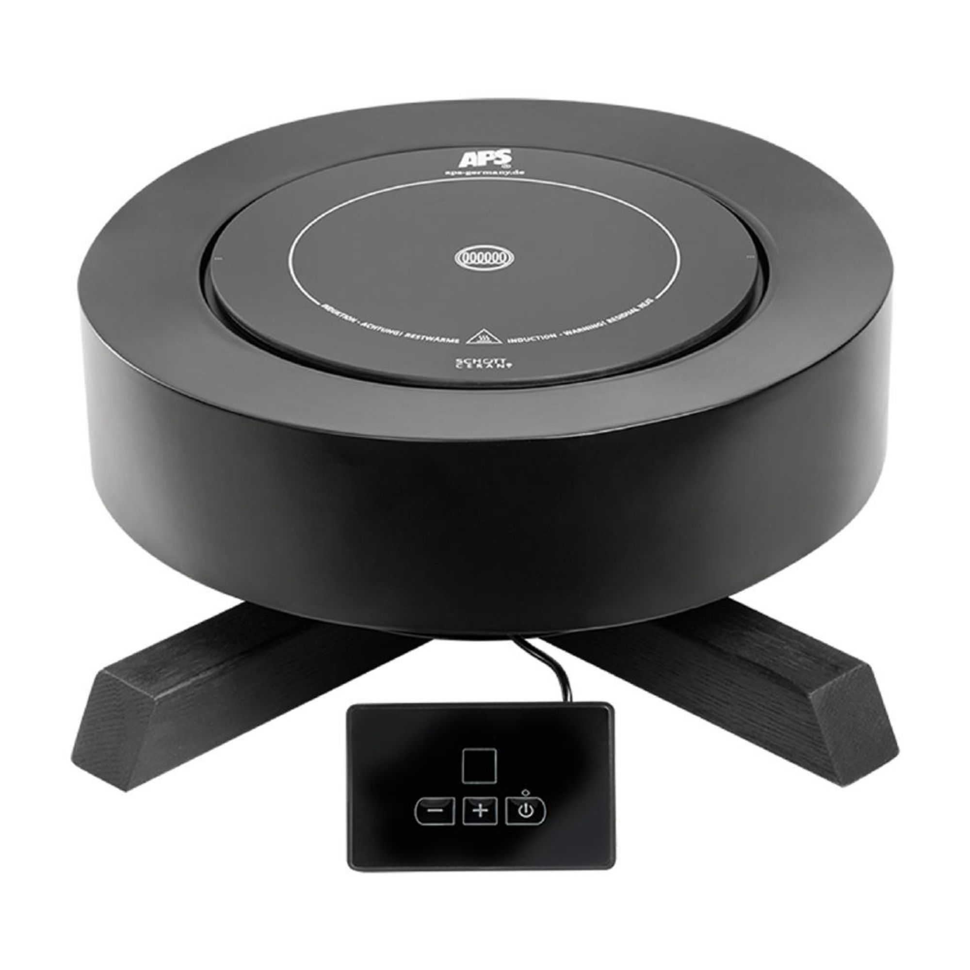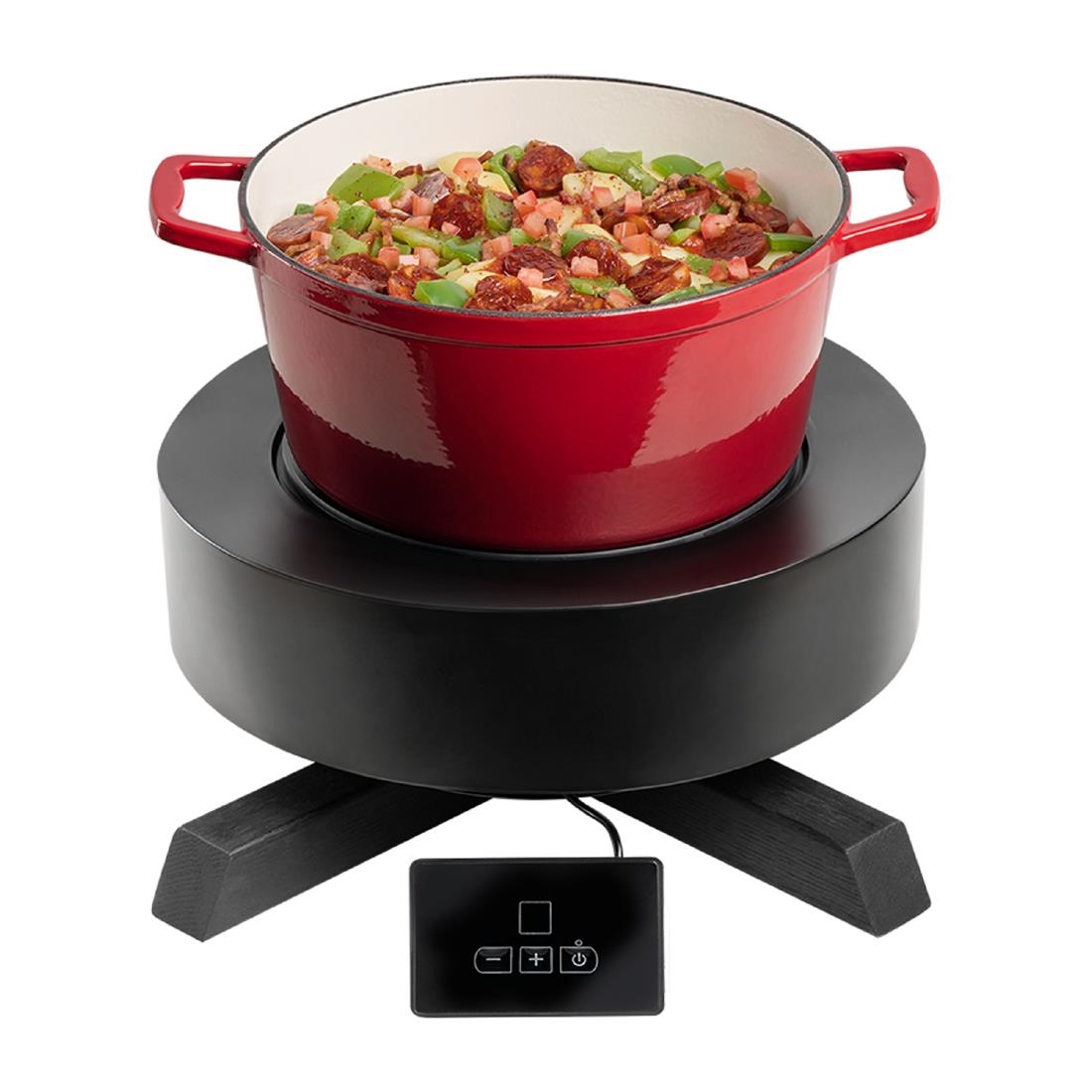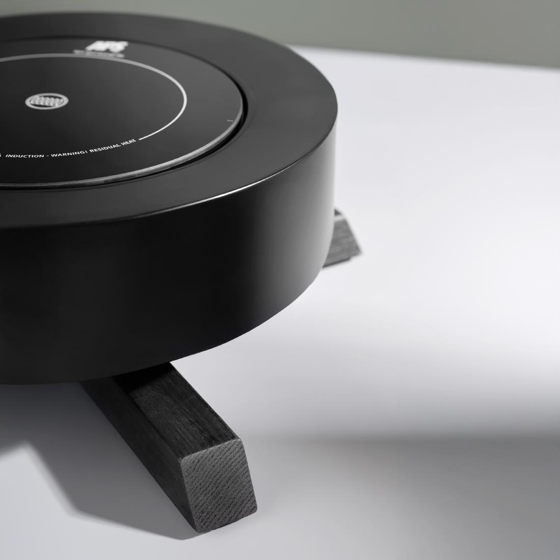 The black metal stand adds both stability and contemporary style, while the oak frame introduces a warm, natural touch. A durable 18/8 stainless steel frame ensures longevity and a sleek finish. Each component is made from high-quality materials, making the APS BONFIRE induction station perfect for both home cooks and professional kitchens.