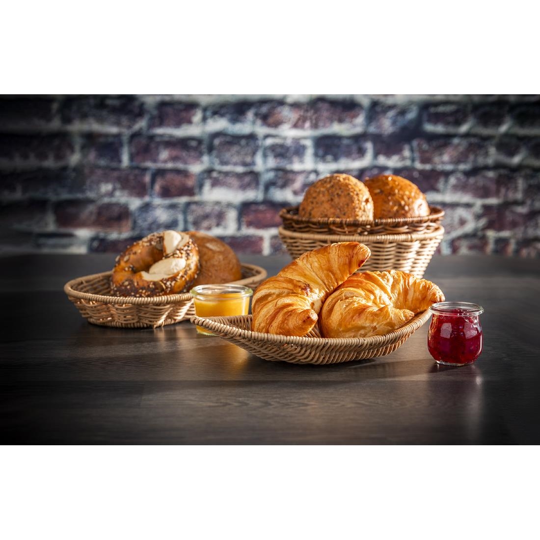 Made from robust beige polypropylene, the APS COVE round basket features a sturdy stainless steel wire frame that keeps it structurally sound and level, so it always sits securely. It's also dishwasher safe, making it easy to clean.