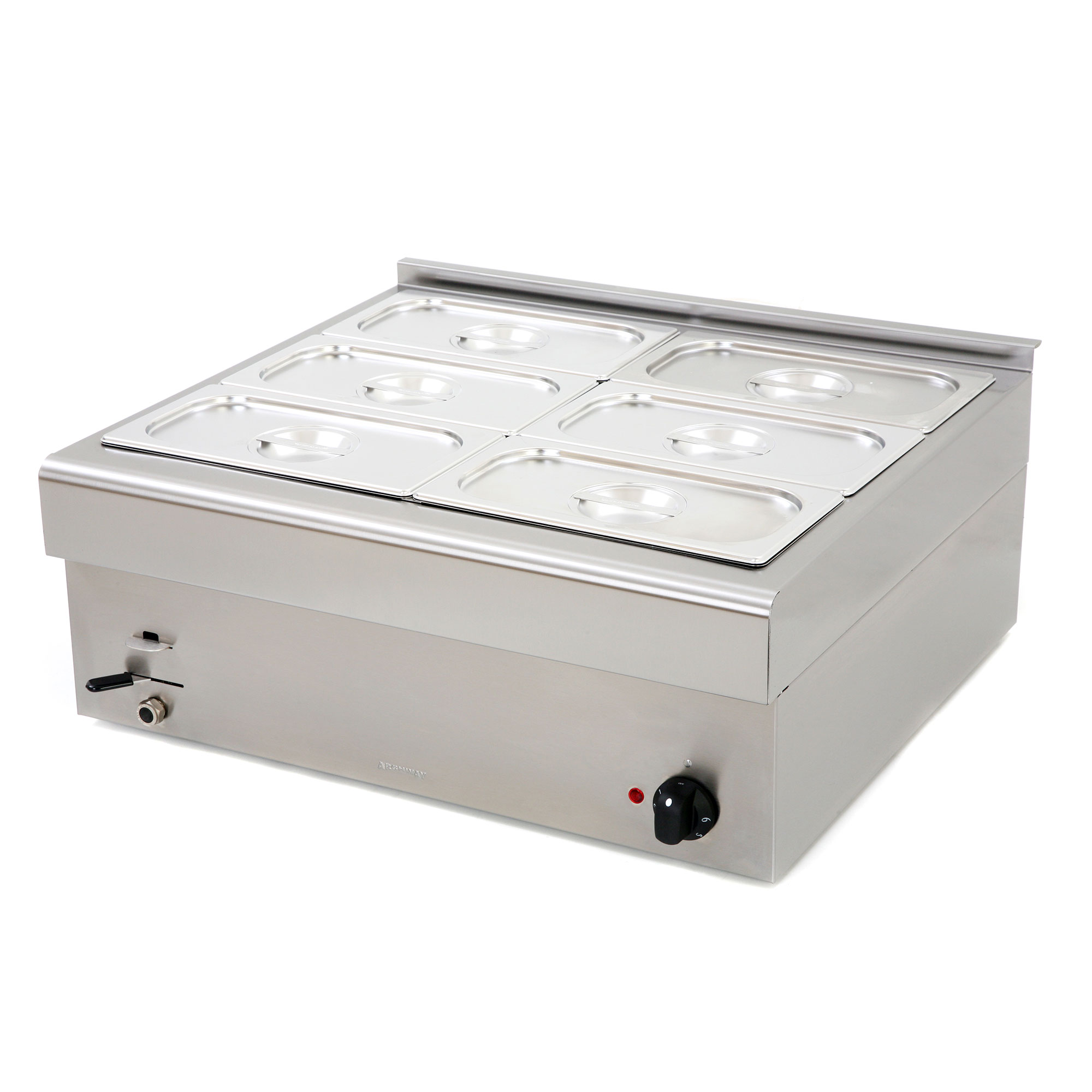 The Archway countertop Gastronorm Bains Marie is an electric six-pot bain-marie known for its superior heating performance. It features an adjustable thermostat and is constructed from stainless steel, ensuring durability and reliability. The removable pans make cleaning effortless. This electric bain-marie is perfect for keeping foods warm, making it an ideal choice for restaurants, buffets, and catered events.