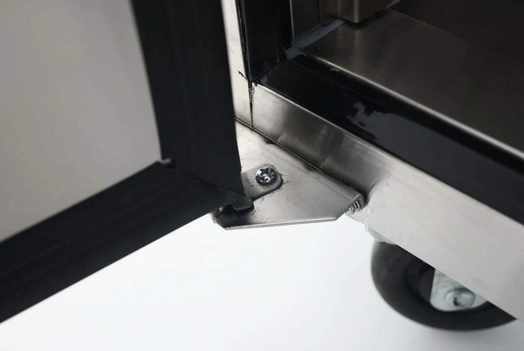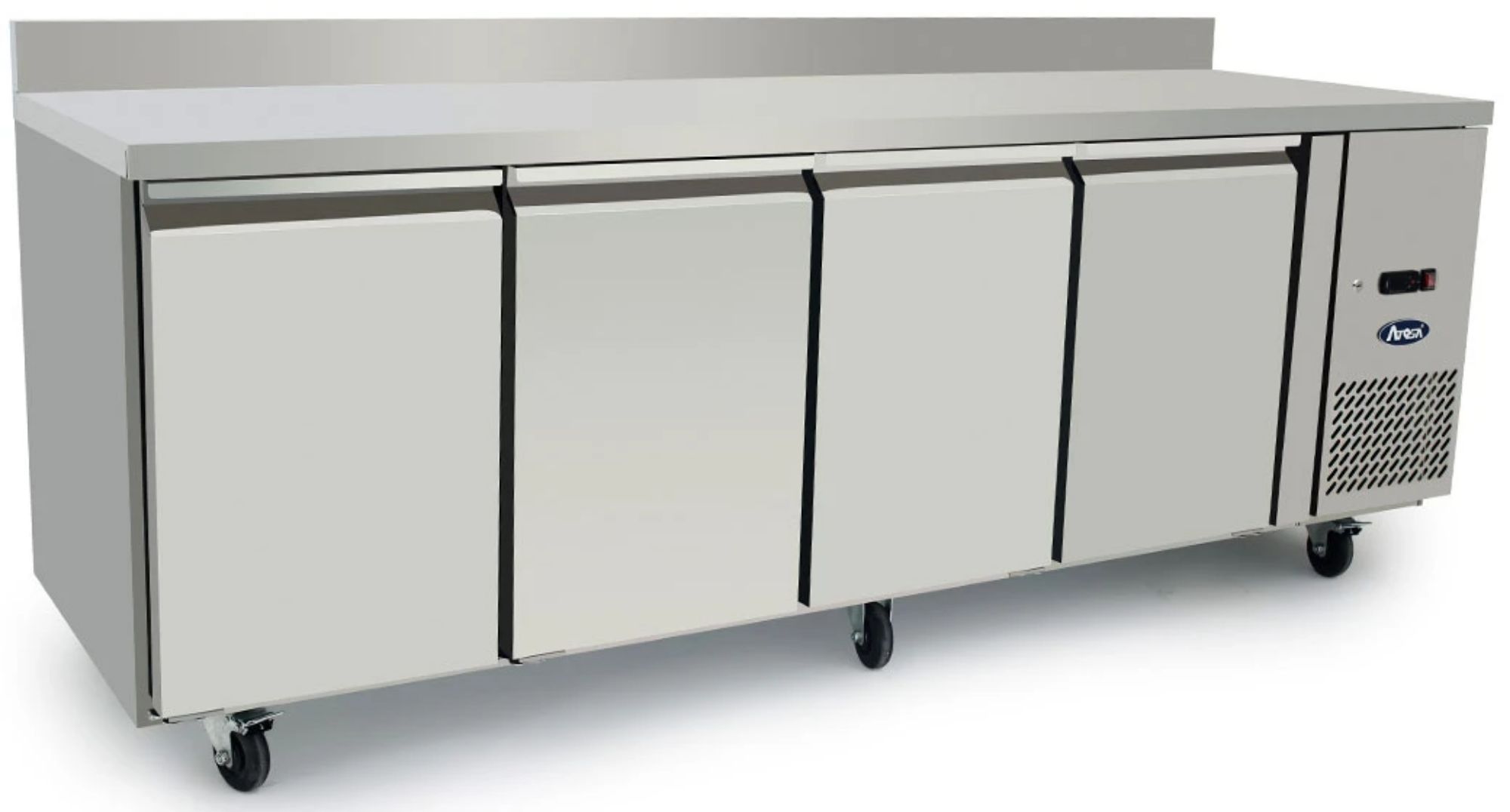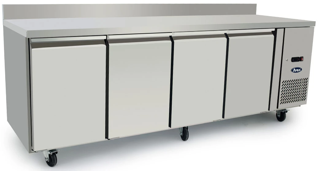 The Atosa EPF3442HD Four Door Table Fridge is constructed with a high-grade stainless steel exterior and interior. It is equipped with a heavy-duty Embraco compressor.