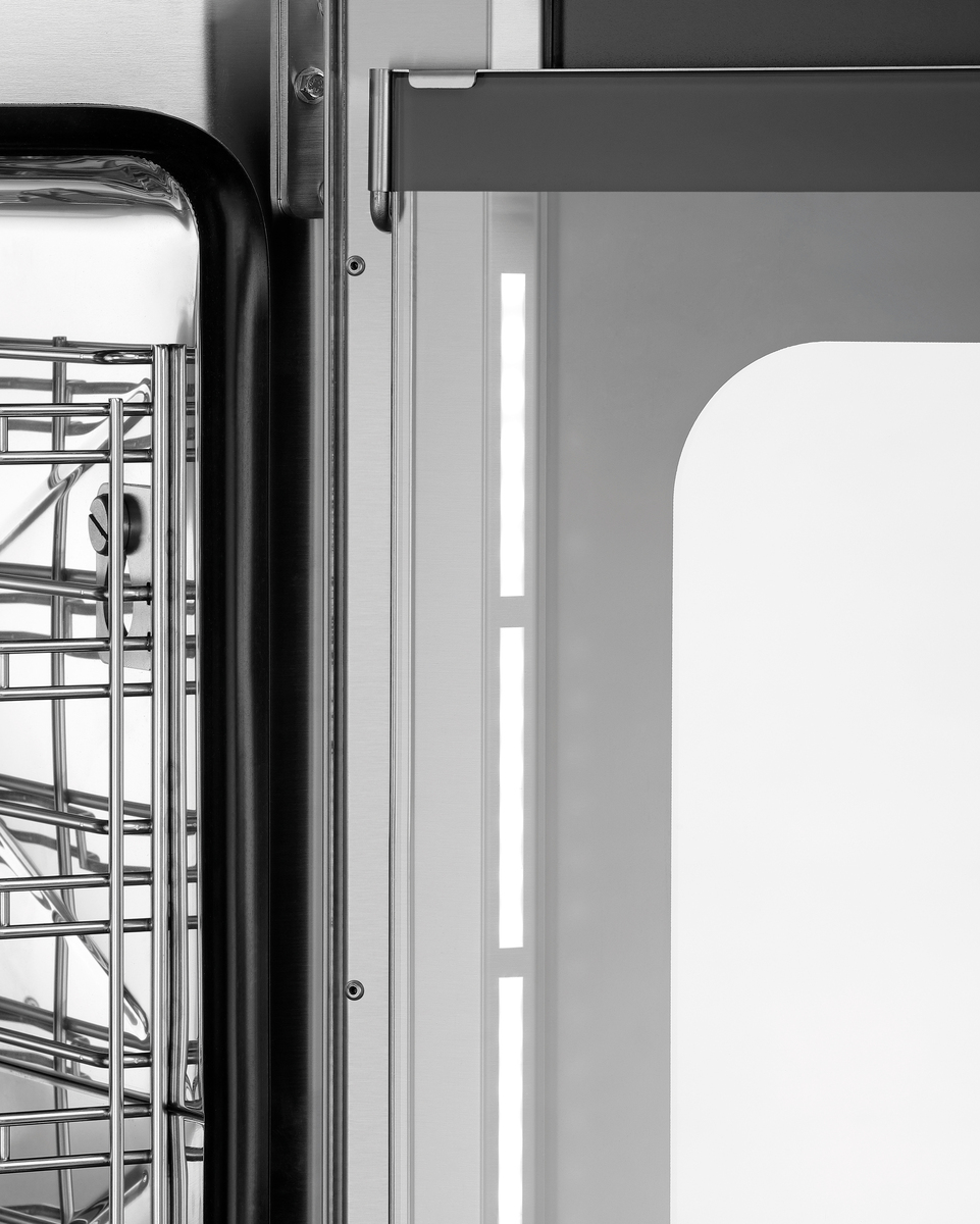 • Properties: Rounded cooking chamber ,Bearing rails can be detached ,Double-winged door pane ,LED lighting in door ,Socket (500 W) for connection of an extractor hood
