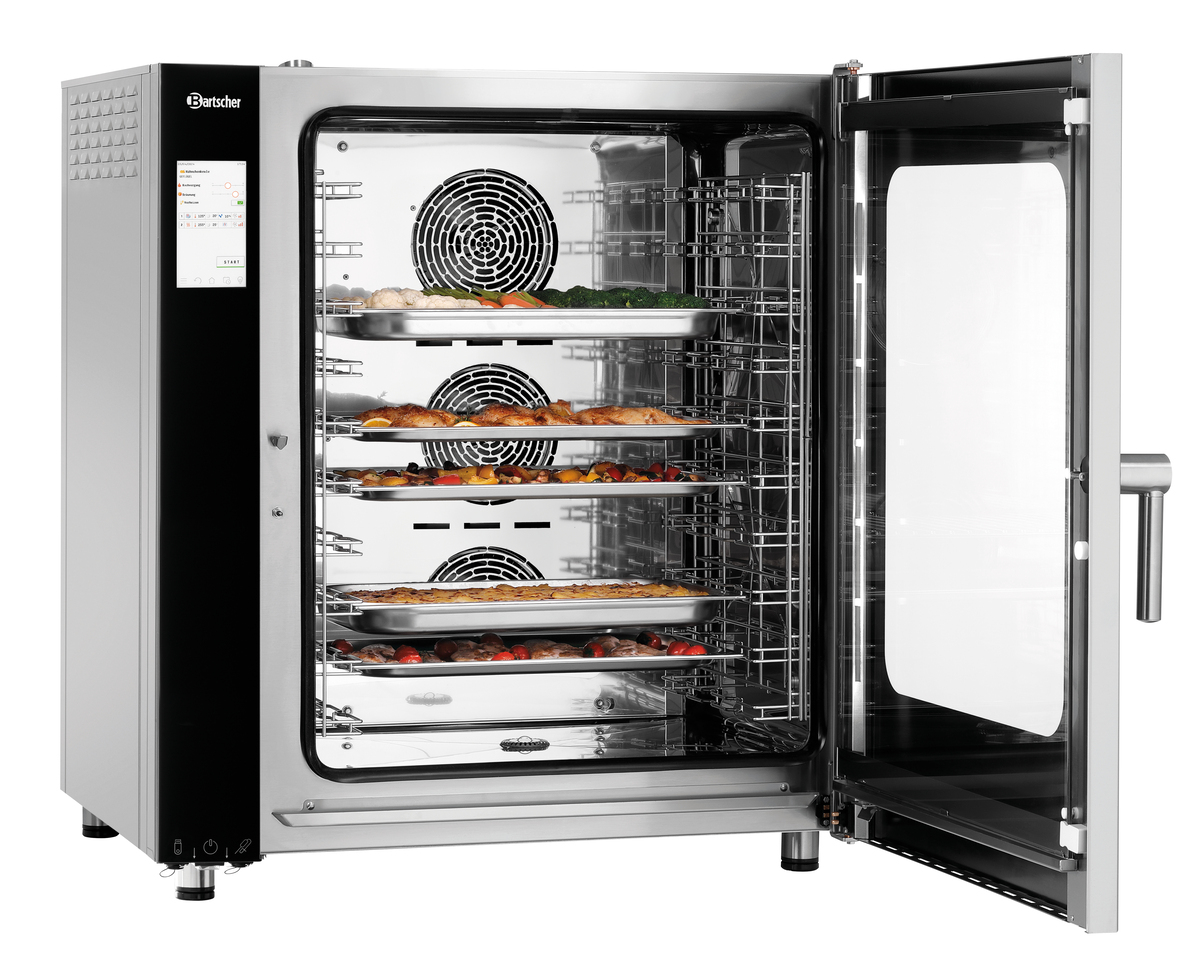 • Properties: Rounded cooking chamber ,Bearing rails can be detached ,Double-winged door pane ,LED lighting in door ,Socket (500 W) for connection of an extractor hood ,Faster heating and reheating times ,Up to 28 % reduction in cooking times ,Ideal for cooking spaces used to full capacity ,Better air circulation thanks to additional motors