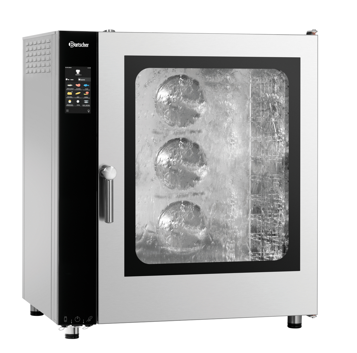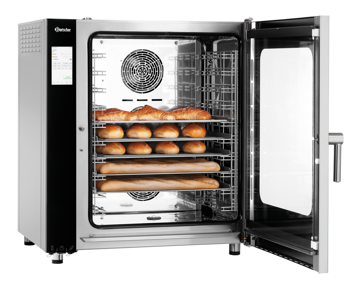 • Properties: Rounded cooking chamber ,Bearing rails can be detached ,Double-winged door pane ,LED lighting in door ,Socket (500 W) for connection of an extractor hood ,Faster heating and reheating times ,Up to 28 % reduction in cooking times ,Ideal for cooking spaces used to full capacity ,Better air circulation thanks to additional motors