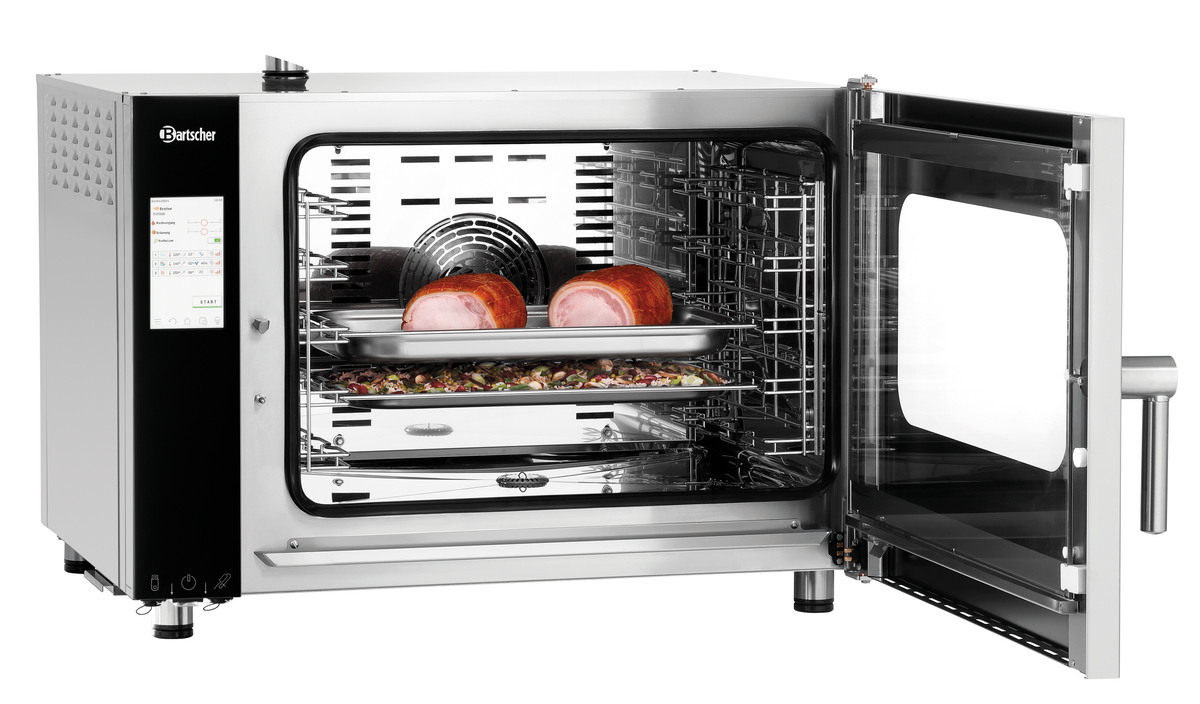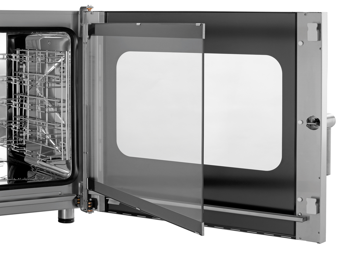 • Properties: Rounded cooking chamber ,Bearing rails can be detached ,Double-winged door pane ,LED lighting in door ,Socket (500 W) for connection of an extractor hood ,Faster heating and reheating times ,Up to 16 % reduction in cooking times ,Ideal for cooking spaces used to full capacity