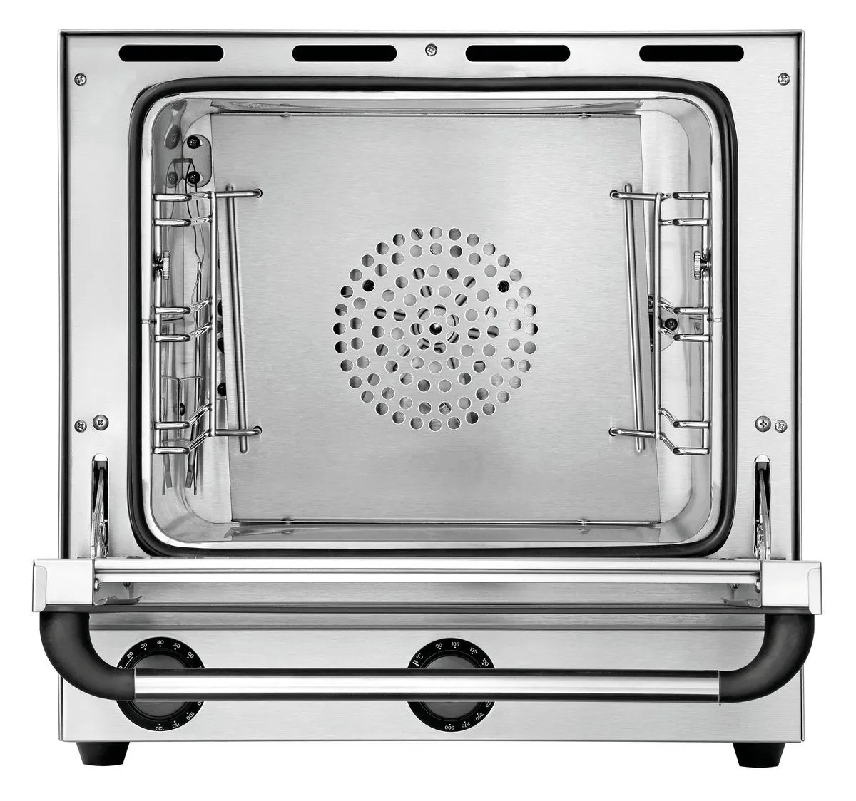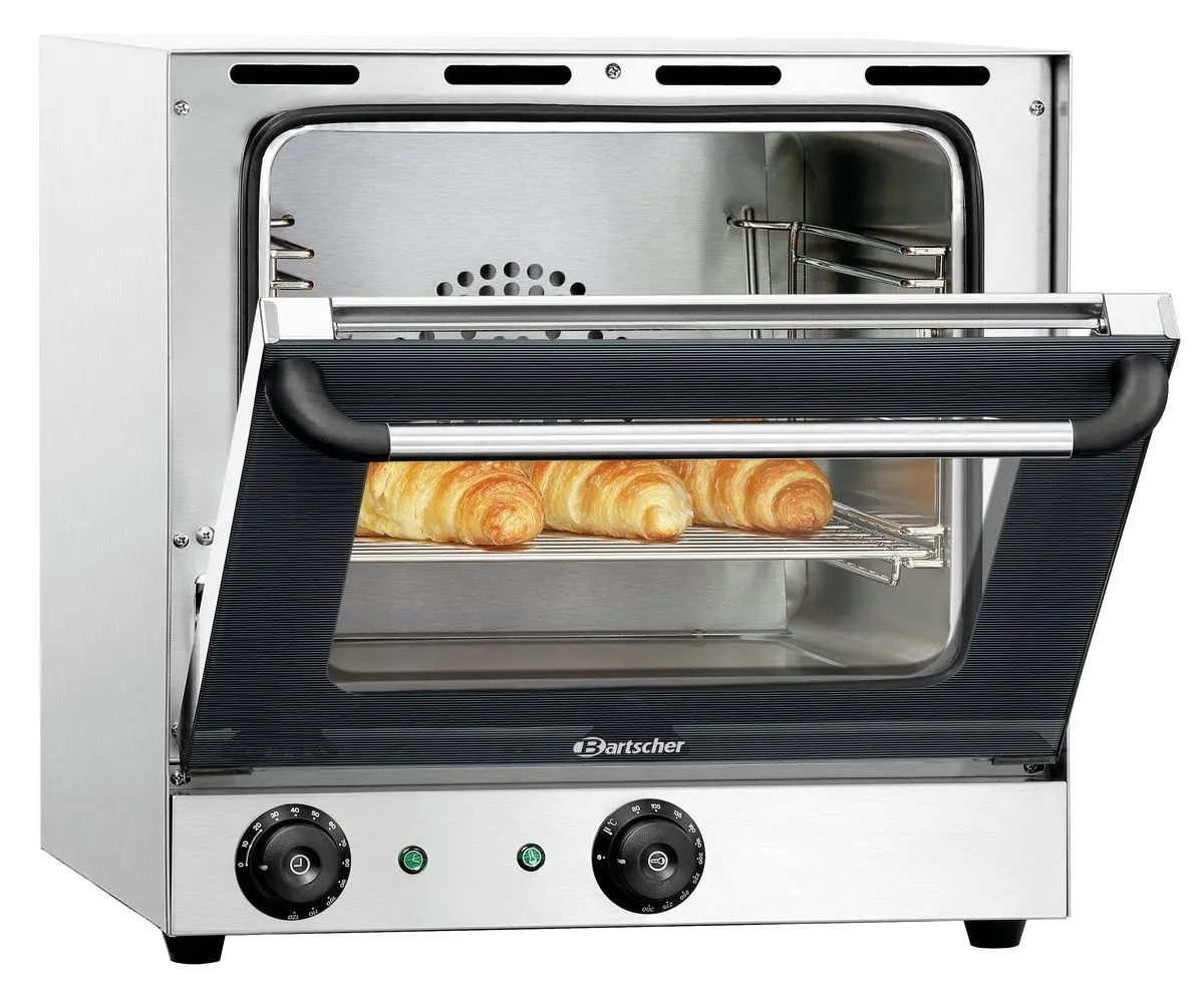 - Properties: Double-winged door pane, Rounded baking chamber, Bearing rails can be detached, Signal tone after expiry of the time