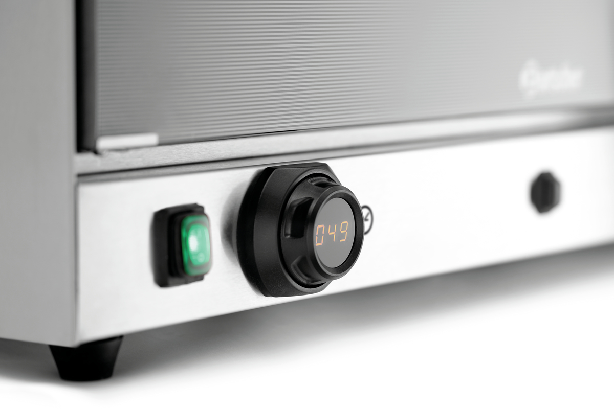 • Properties: Rounded baking chamber ,Bearing rails can be detached ,Double-winged door pane ,Knob with digital display for temperature and time ,Memory function ,Possible cooking pause using the temperature controller ,Audible signal when the time expires (1 120 minutes)
