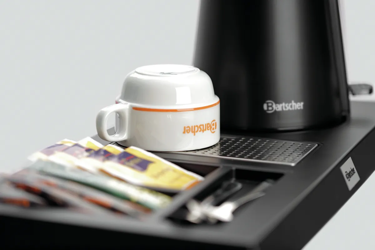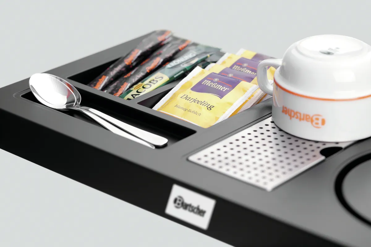 - Properties: 3 storage compartments for tea, instant coffee, sugar, and spoons/stirrers