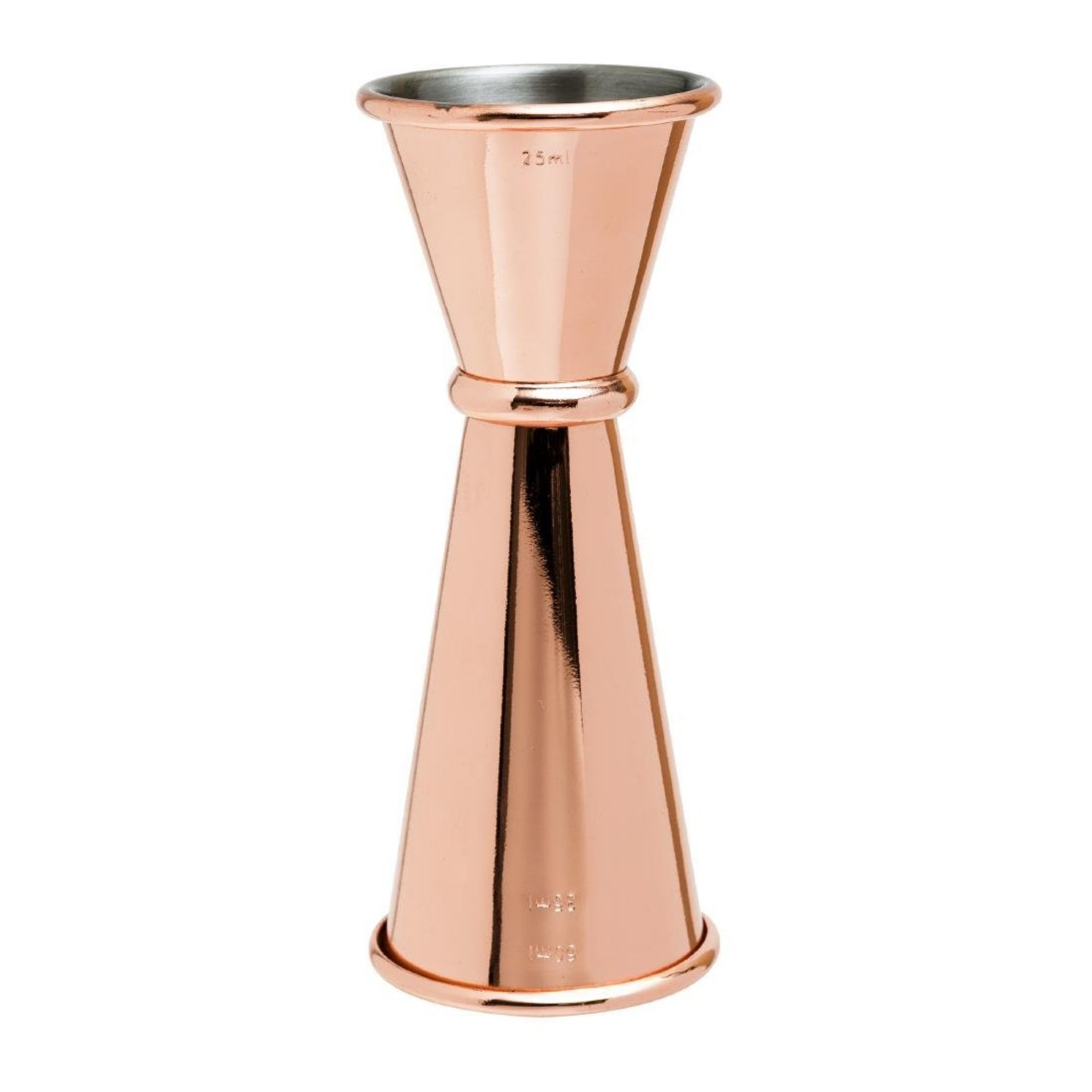 The banded jigger features a beautiful double cup design that supports measurements of 25 ml, 35 ml, and 50 ml. Finished in polished copper plating, this jigger is not only aesthetically pleasing but also enjoyable to use.
