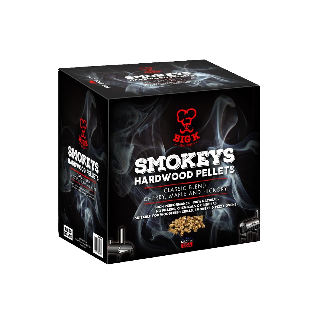 Perfect for use in pellet grills, smokers and pizza ovens, Big K's Smokeys hardwood pellets contain a premium mix of equal parts hickory, maple, and cherry.