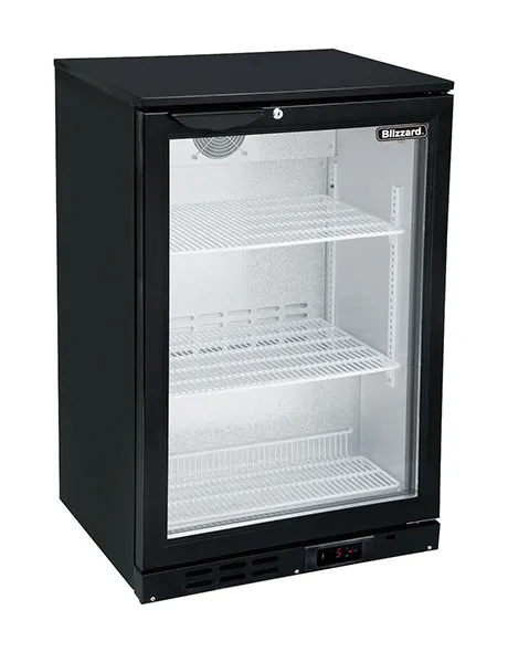 The Blizzard LOWBAR1 Low Height Single Door Bottle Cooler is ideal for consistently and reliably keeping bottles at the desired temperature. With an understated black exterior and an aluminum stippled, LED-lit interior, this undercounter unit is perfect for displaying drinks, even in a dark environment.