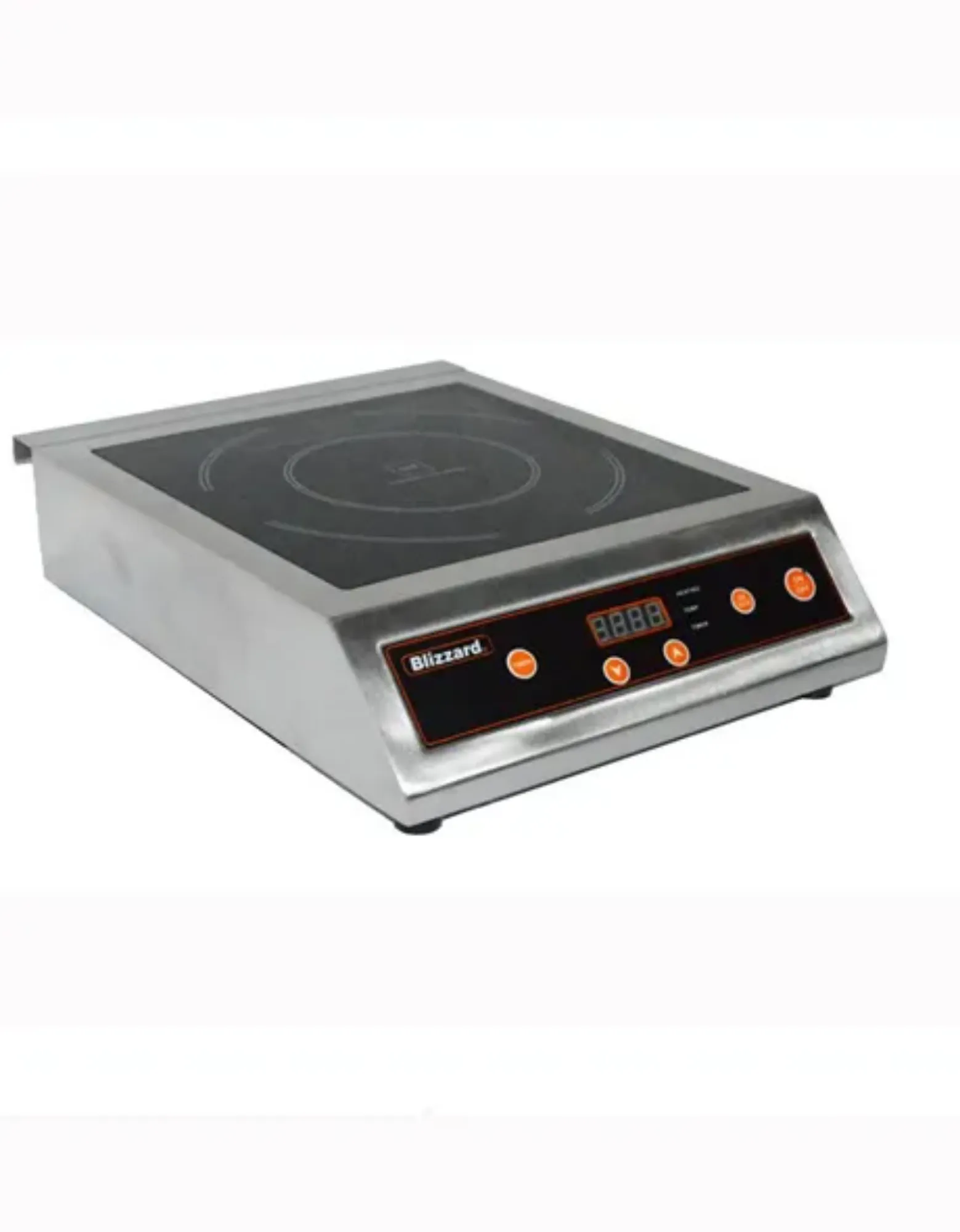 The Blizzard BIH1 Single Induction Hob features a stainless steel construction, making it suitable for use with a variety of pans. It is designed with an LCD display and is fitted with a Schott glass hob.