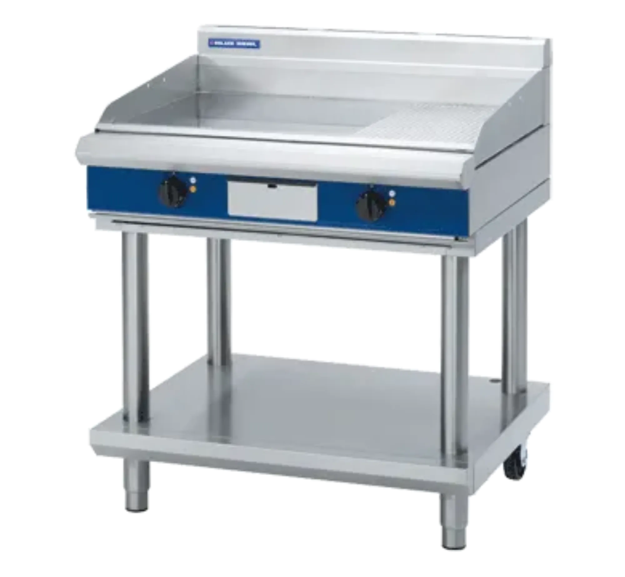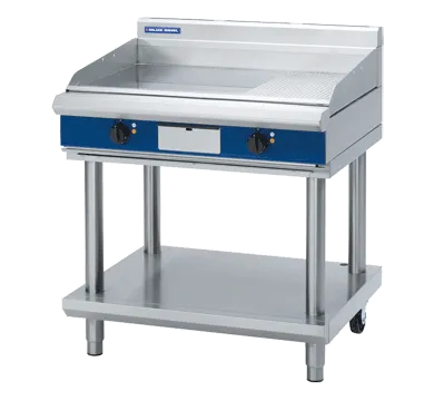 The Blue Seal EP516-LS 900mm electric griddle offers compact, yet powerful and reliable performance. Equipped with a robust 12kW thermostatic element controlled by heavy-duty dial controls, this griddle can easily handle busy breakfast, lunch, and dinner services. Despite its power, it remains easy to operate and simple to clean. The griddle's robust stainless steel stand includes a convenient undershelf for additional storage and rear castors for easy positioning.