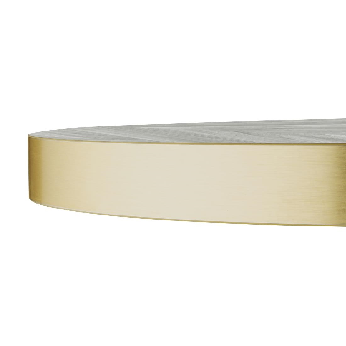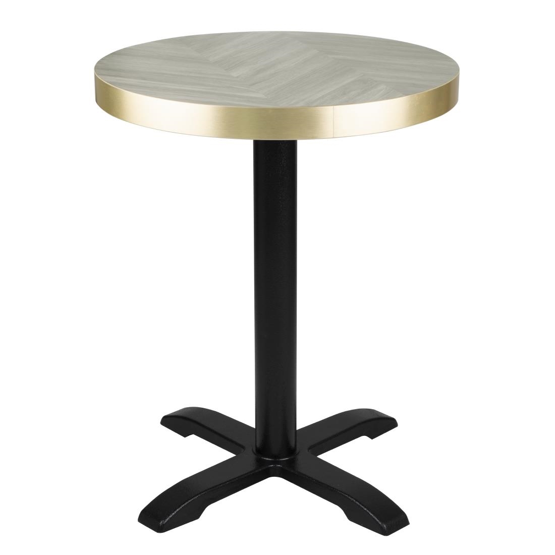 With its vibrant chevron print and gold edge finish, this round table top from Bolero is perfect for any commercial hospitality, office, or café setting. The tabletop comes pre-drilled for easy attachment to Bolero's range of table bases and features no dirt traps, allowing it to be wiped clean quickly between services. Its surface is both stain and scratch resistant, ensuring durability and easy maintenance.