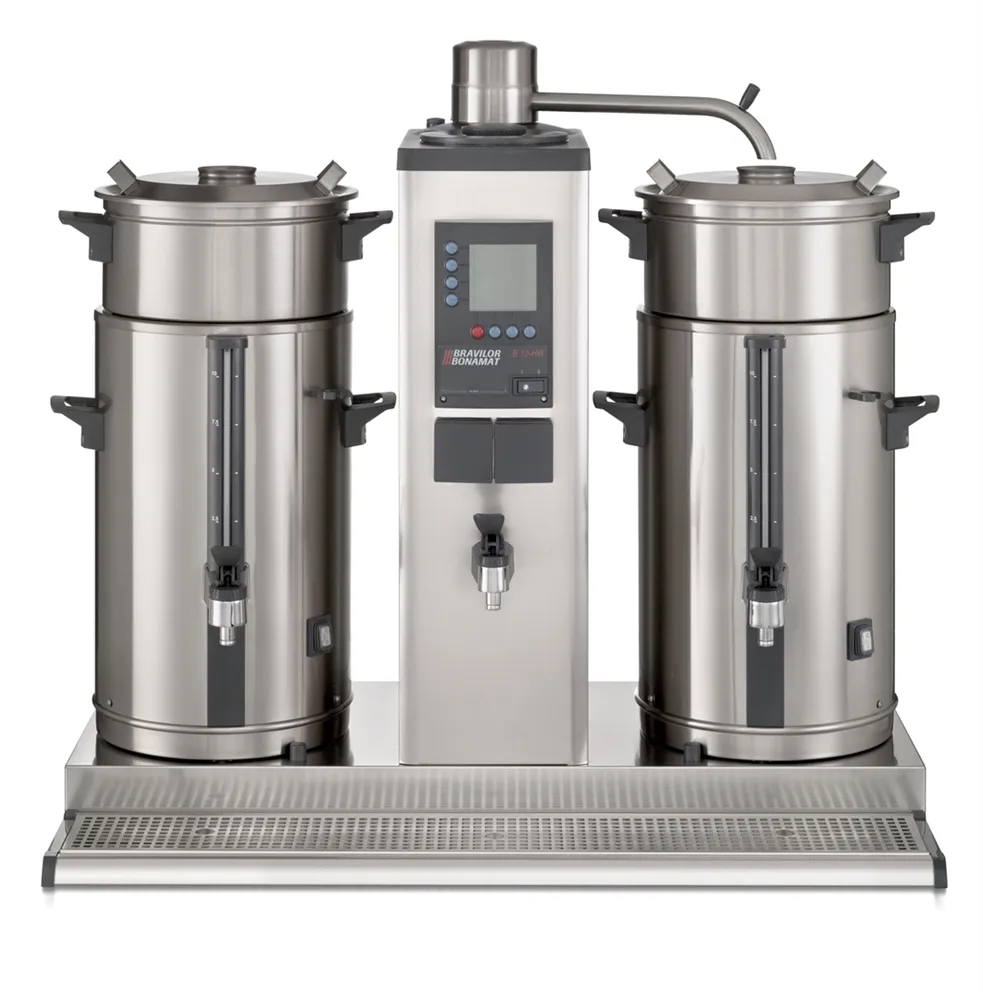 Features one brewing system, a separate hot water tap, and two containers with a capacity of 20 liters each.