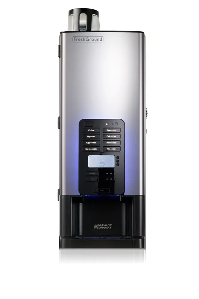 The machine is equipped with three canisters, one specifically for beans, allowing it to prepare a variety of beverages including coffee, espresso, cappuccino, chocolate, coffee with milk, Wiener melange, espreschoc, and hot water. It features a selection key for adding milk to coffee, making it versatile for different preferences. Designed for locations with a water connection, the machine includes digital controls, a separate hot water tap, a plastic drip tray, an automatic descale indicator, and a rinsing program. Additionally, it is available in a model with a coin mechanism (C), catering to various operational needs.