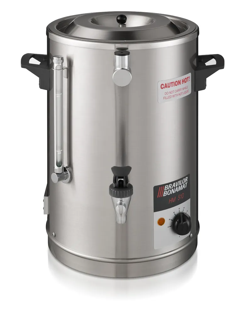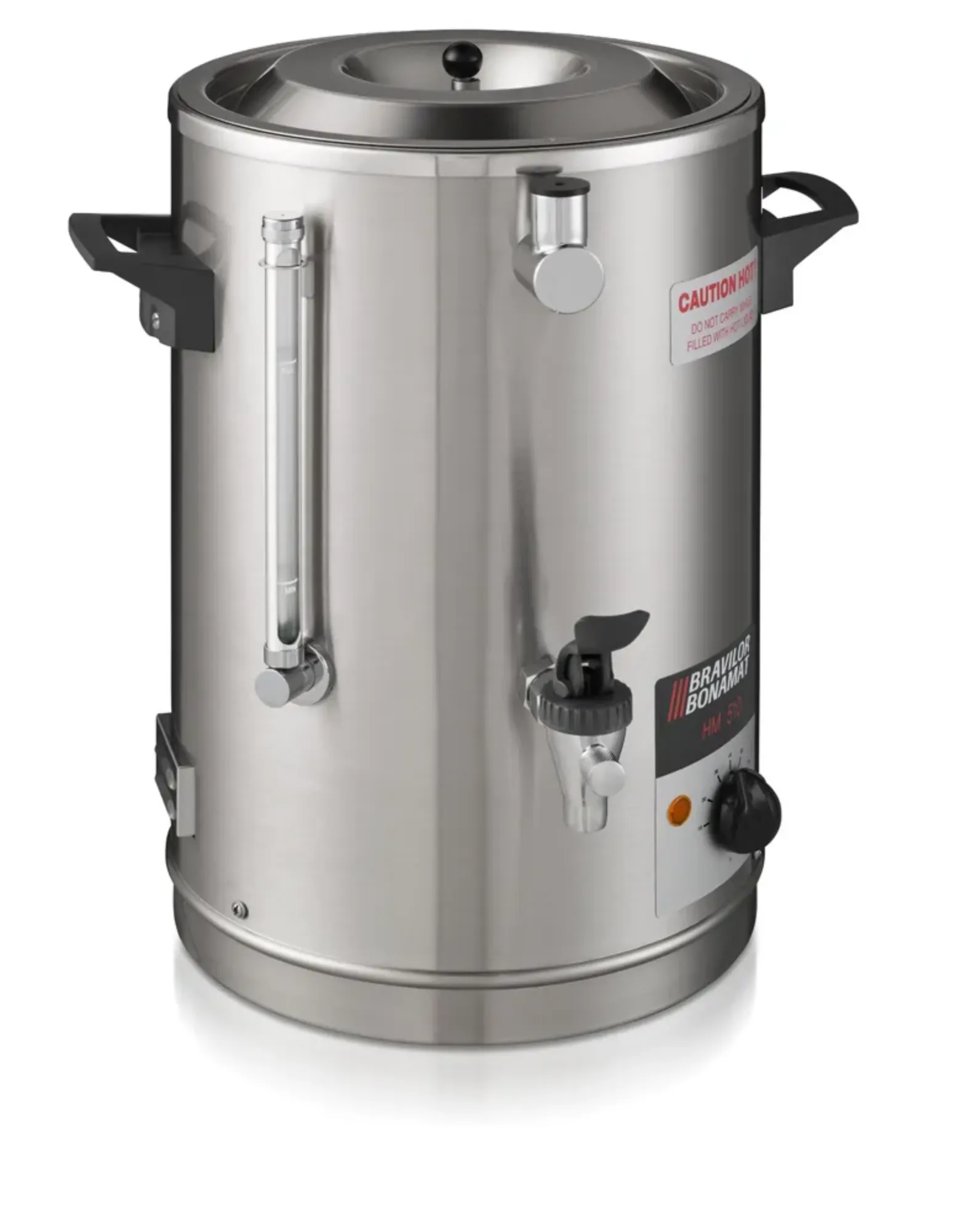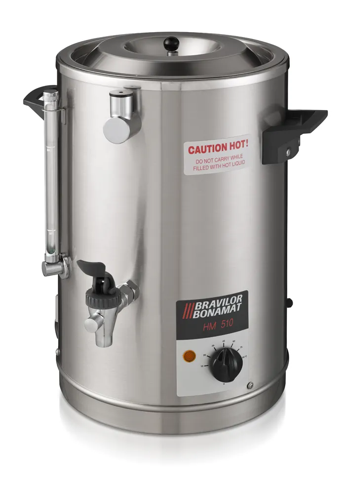 The water level in the bain-marie system is clearly visible through the gauge glass