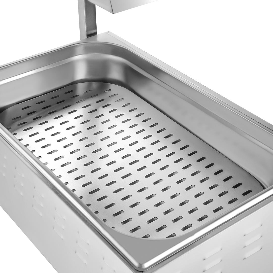 Keep chips crisp and service swift with the Buffalo chip scuttle and food warmer. Delivering dependable 750W hot holding, the unit features independently controlled heat above and below to balance warmth and texture - ideal for chips, wedges and fried sides. An overhead quartz heat bulb adds both direct heat and an inviting glow, showcasing portions at the pass or front of house to speed selection and reduce waste.