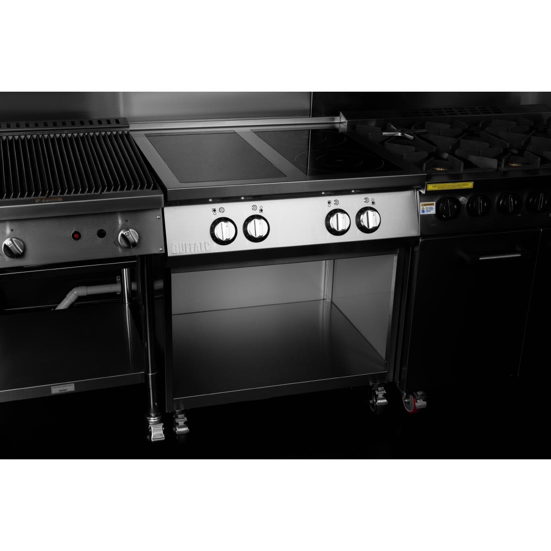 Bring the energy-saving efficiency of induction cooking into your professional kitchen with the Buffalo freestanding 4 zone induction hob. By combining user-friendly controls with high-performance cooking, the hob is an excellent choice for preparing a wide variety of dishes, all while using significantly less energy compared to traditional gas or electric alternatives.