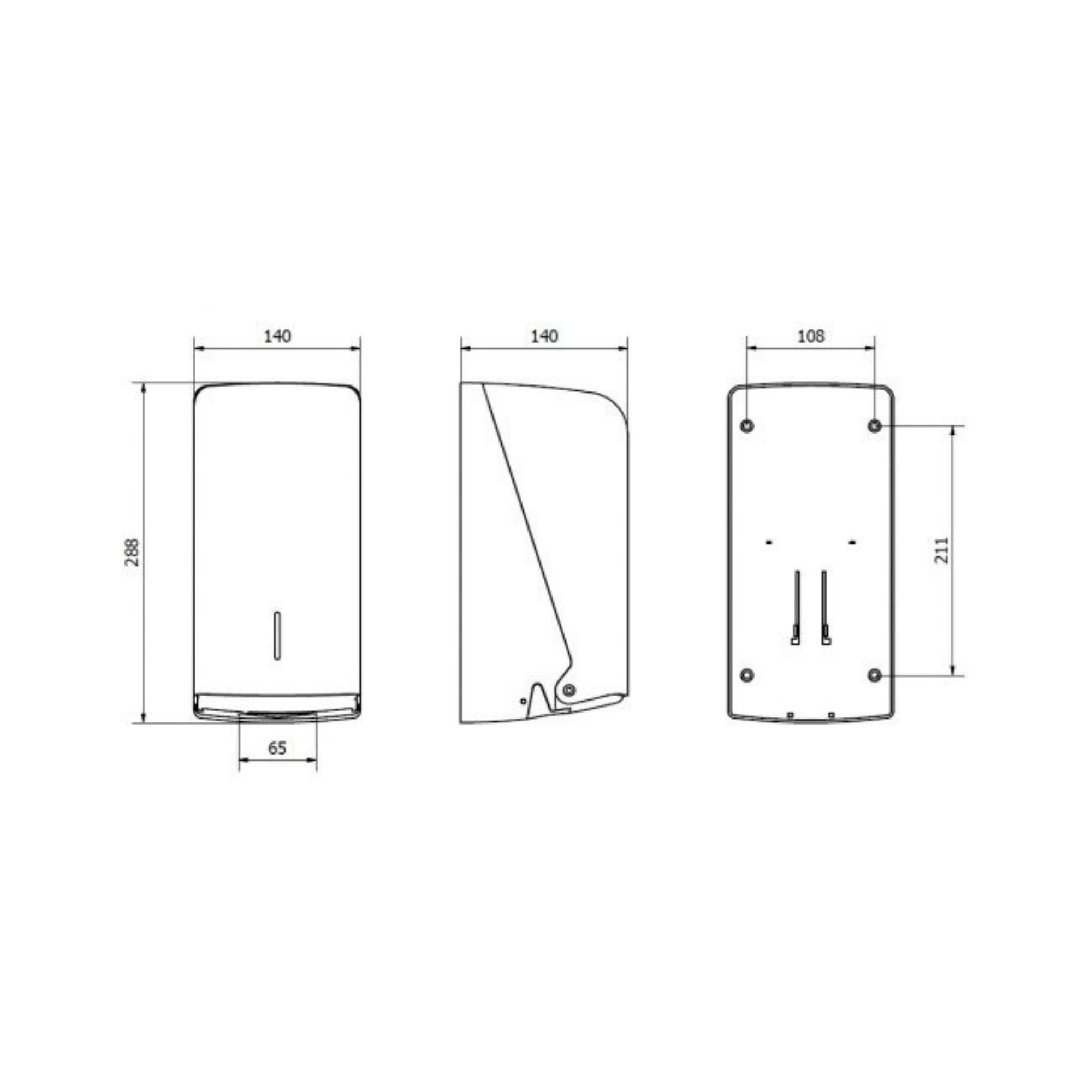 Dimensions - (H)287mm (W)141mm (D)138MM Weight - 0,55kg Capacity - 400 Z-Fold Toilet Sheets