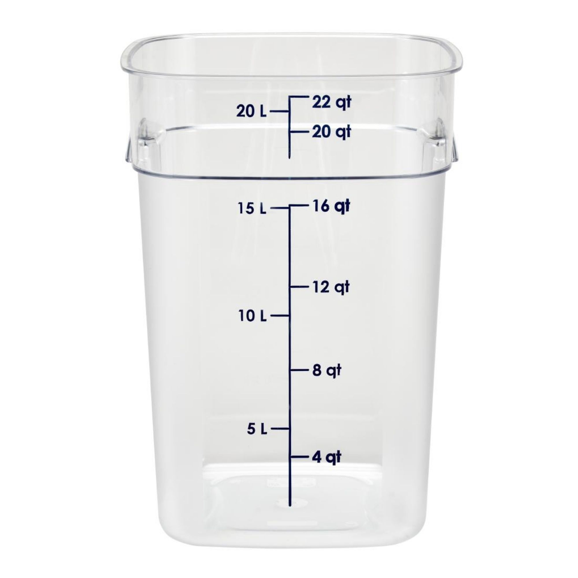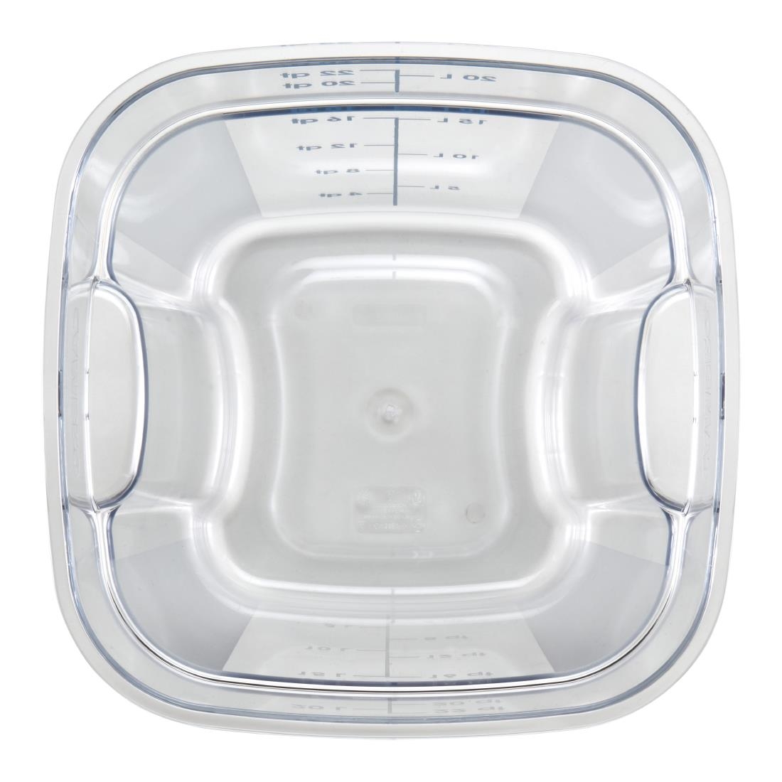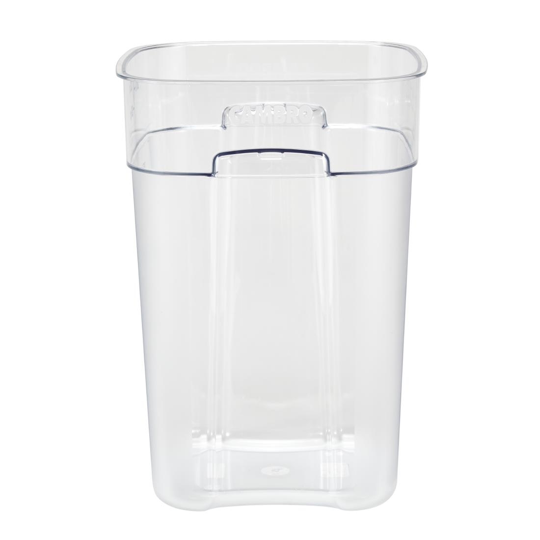Keep food and ingredients fresh with the CamSquares FreshPro Series food storage container from Cambro. Thanks to its polypropylene construction, the container is highly durable and resistant to staining, acid damage, and odor retention. Its molded-in recessed handles, which are seamlessly integrated into the container's design, not only facilitate an easy grip but also take up less storage space. Additionally, curved corners and a textured grip allow for safer, four-sided pouring and easier handling.