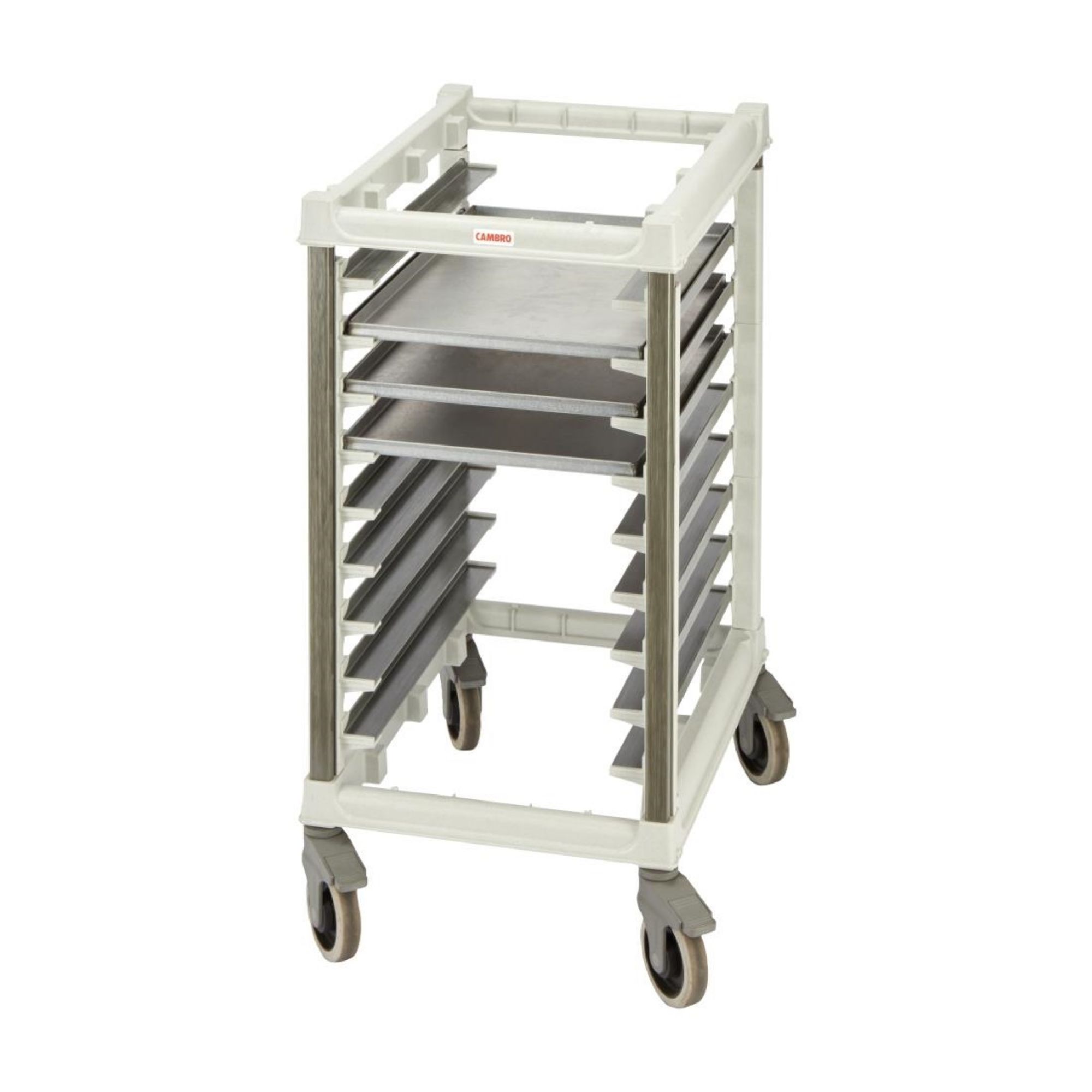 Unlike its metal counterparts, the Cambro bakery trolley eliminates replacement costs and common issues such as broken rails, rusted casters, and metal-on-metal friction and buildup. There are no metal parts; from top to bottom, it's corrosion and rust-free. Each high-performing plastic caster has a total locking brake, which locks both the swivel and the wheel. It fits 600x400mm bakery trays.