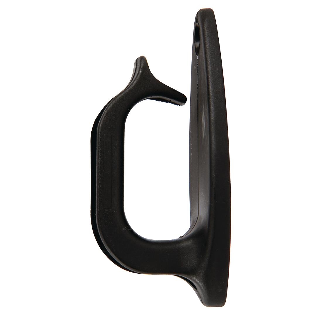 Specially designed nylon hook can be attached to underside of tables and used by customers to hang bags and personal belongings. Items are easily placed onto the clip, but must be removed with two hands. This takes bags safely off the floor and helps prevent handbag "snatching" by making quick theft virtually impossible.