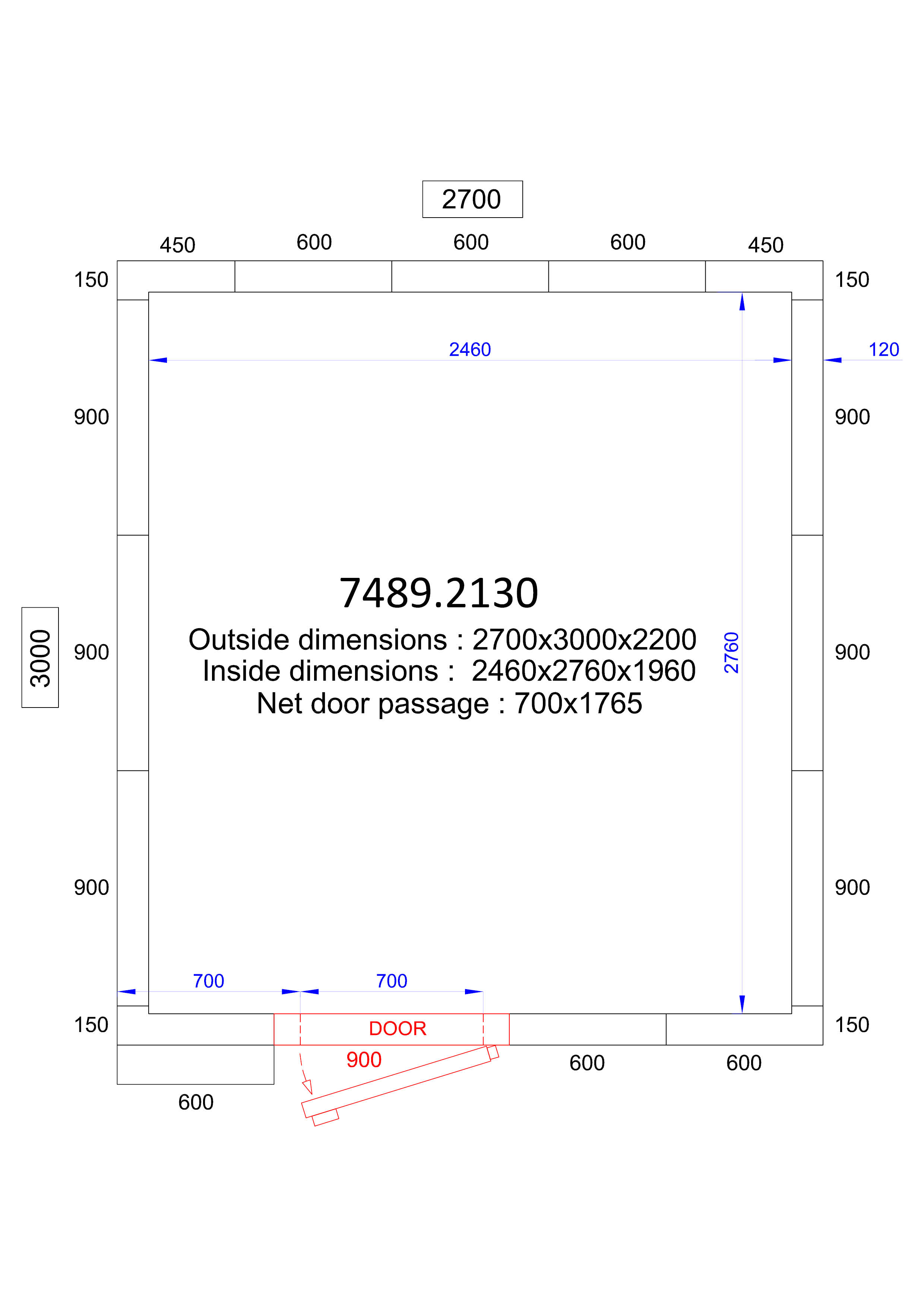 - Interior Dimensions (WxDxH): 2460x2760x1960 mm
