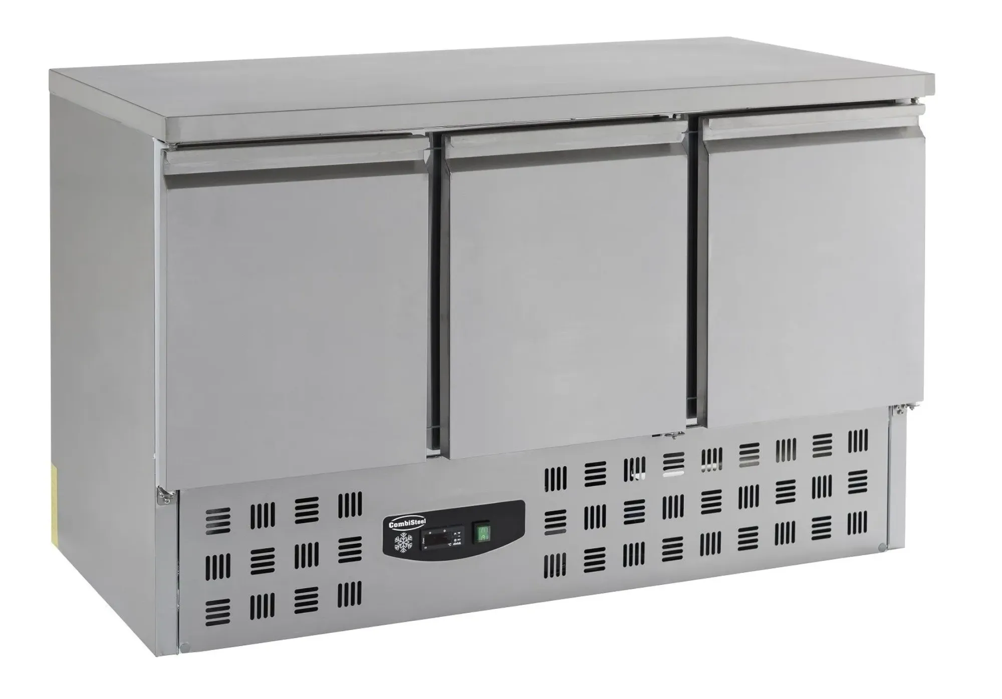 The stainless steel three-door refrigerated prep counter is designed for use in commercial kitchens. This high-quality unit provides ample space for food preparation while ensuring ingredients remain fresh and at the optimal temperature. Its durable stainless steel construction ensures longevity and easy maintenance, making it an ideal choice for busy kitchen environments. The three-door design offers convenient access to stored items, enhancing efficiency and workflow in food preparation areas. This refrigerated prep counter is a reliable and essential addition to any commercial kitchen setup.