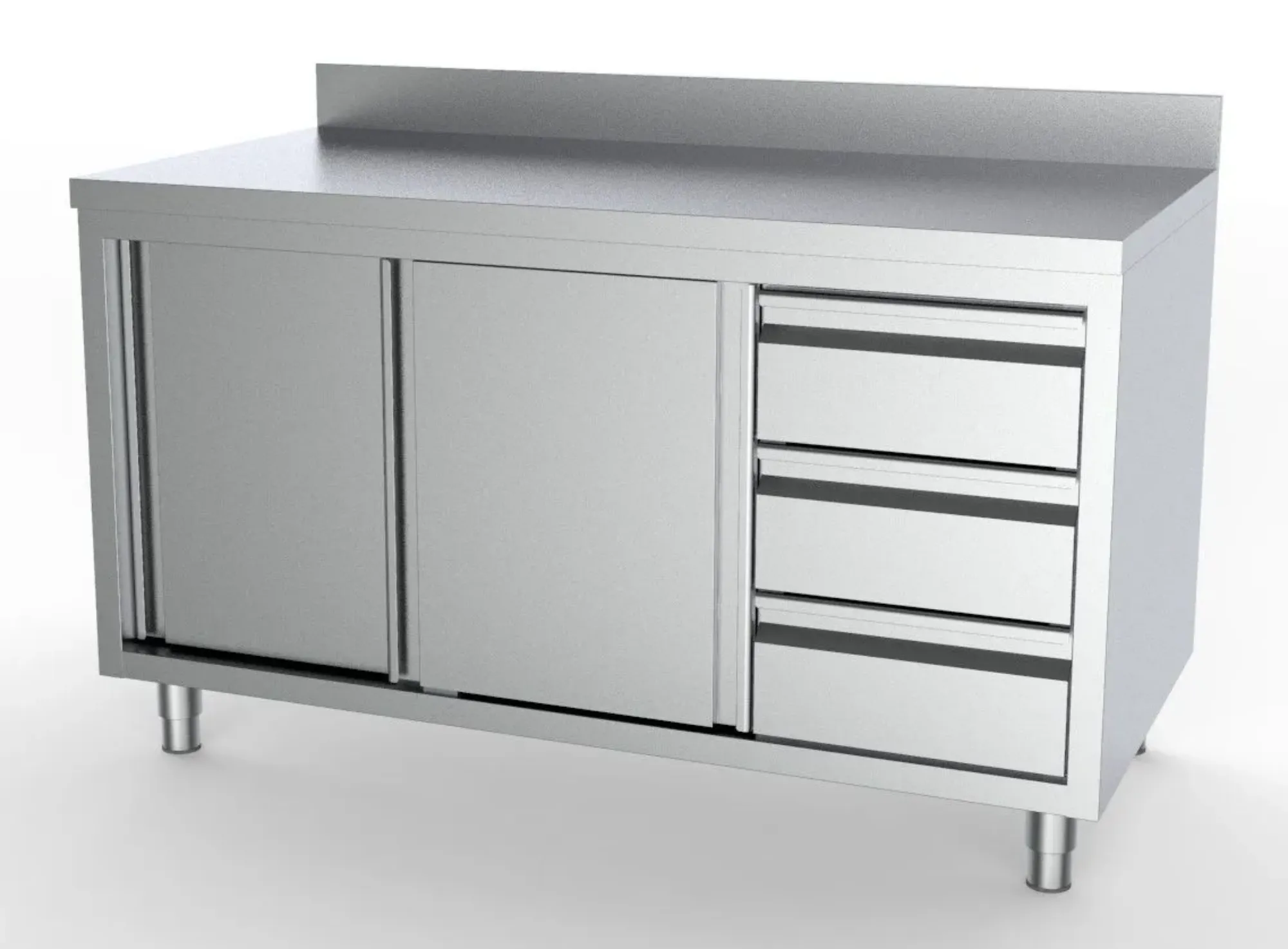Manufactured in stainless steel AISI 304, this product features a working top made from AISI 304 sheet. It includes sliding doors mounted on hygienic rails, which are easily removable without the need for mechanical tools, and comes with an internal adjustable shelf. Additionally, it is equipped with a 3-drawer unit on stainless steel rails. The product stands on stainless steel telescopic feet, with the rear ones advanced for a rounded floor.