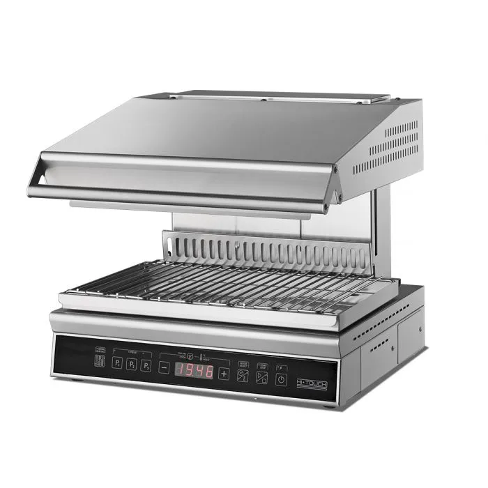 The Giorik "Hi Touch" electric salamander grill reaches temperature in under 20 seconds, dramatically reducing power consumption by up to 70%. It is equipped with three programmable menu settings, a cook and hold function, an auto start/stop mechanism, and a height-adjustable grilling head, making it an indispensable part of any kitchen.