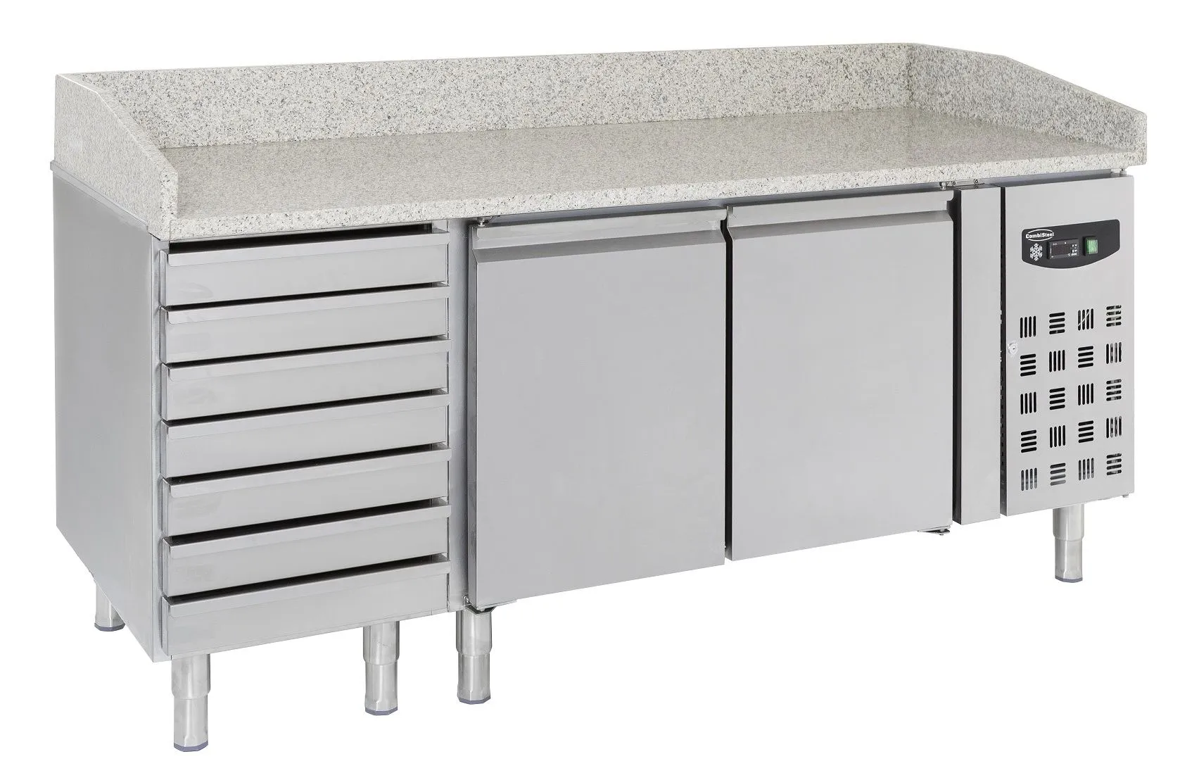 This large pizza prep counter from Combisteel features a granite worktop, two doors of understorage, and seven drawers for dough ball storage. A glass topping unit is also available.