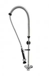 The commercial spray-off unit is equipped with both hot and cold taps, designed to assist in the pre-washing of crockery, utensils, pots, and pans.