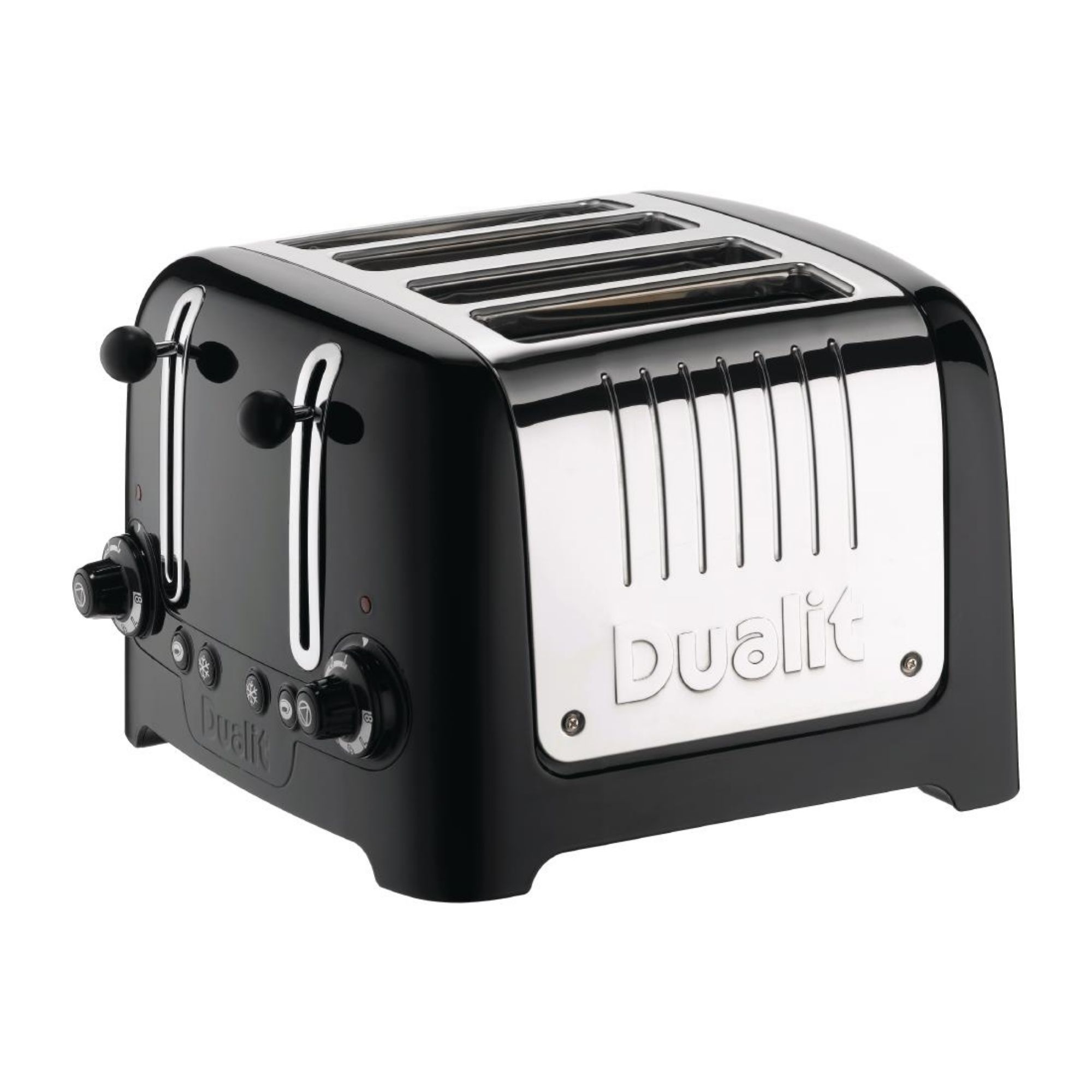 The Dualit toaster is a compact and convenient appliance, featuring a high gloss finish and a variety of useful functions. It includes a defrost mode, a cancel button, and a bagel or bun warming setting, which toasts one side while warming the other. The 'Peek and Pop®' function allows users to check the toast mid-cycle by lifting the high lift ejection lever without interrupting the process. The toaster's high gloss finish is easy to clean and maintain.