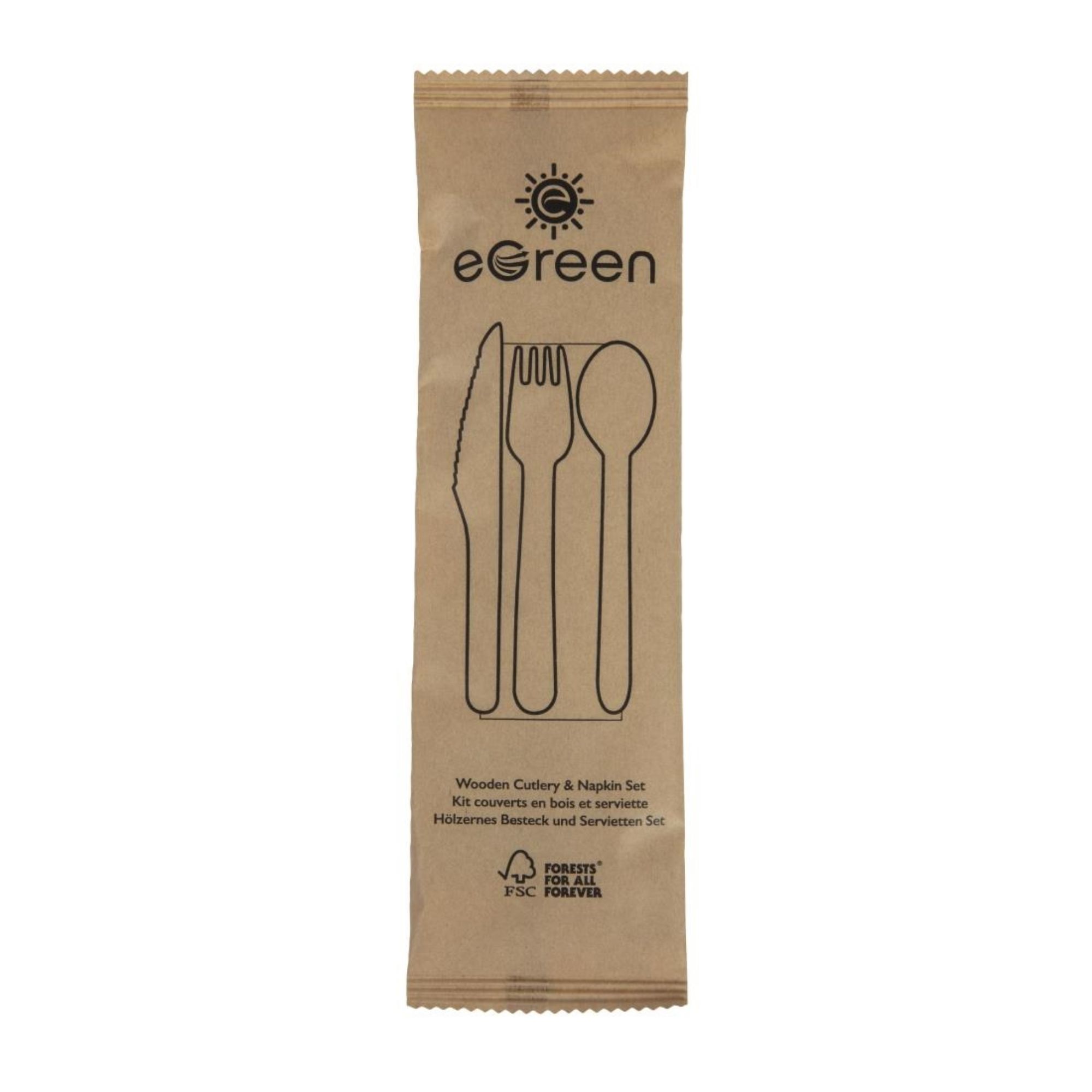 Looking for disposable cutlery that's both practical and eco-friendly? These individually wrapped, four-piece wooden service packs from eGreen are exactly what you need. As each of these sets is individually wrapped, there's no risk of them becoming contaminated in storage or during delivery. This allows you to improve your food-to-go hygiene standards and provide customers with complete peace of mind when enjoying their meals.