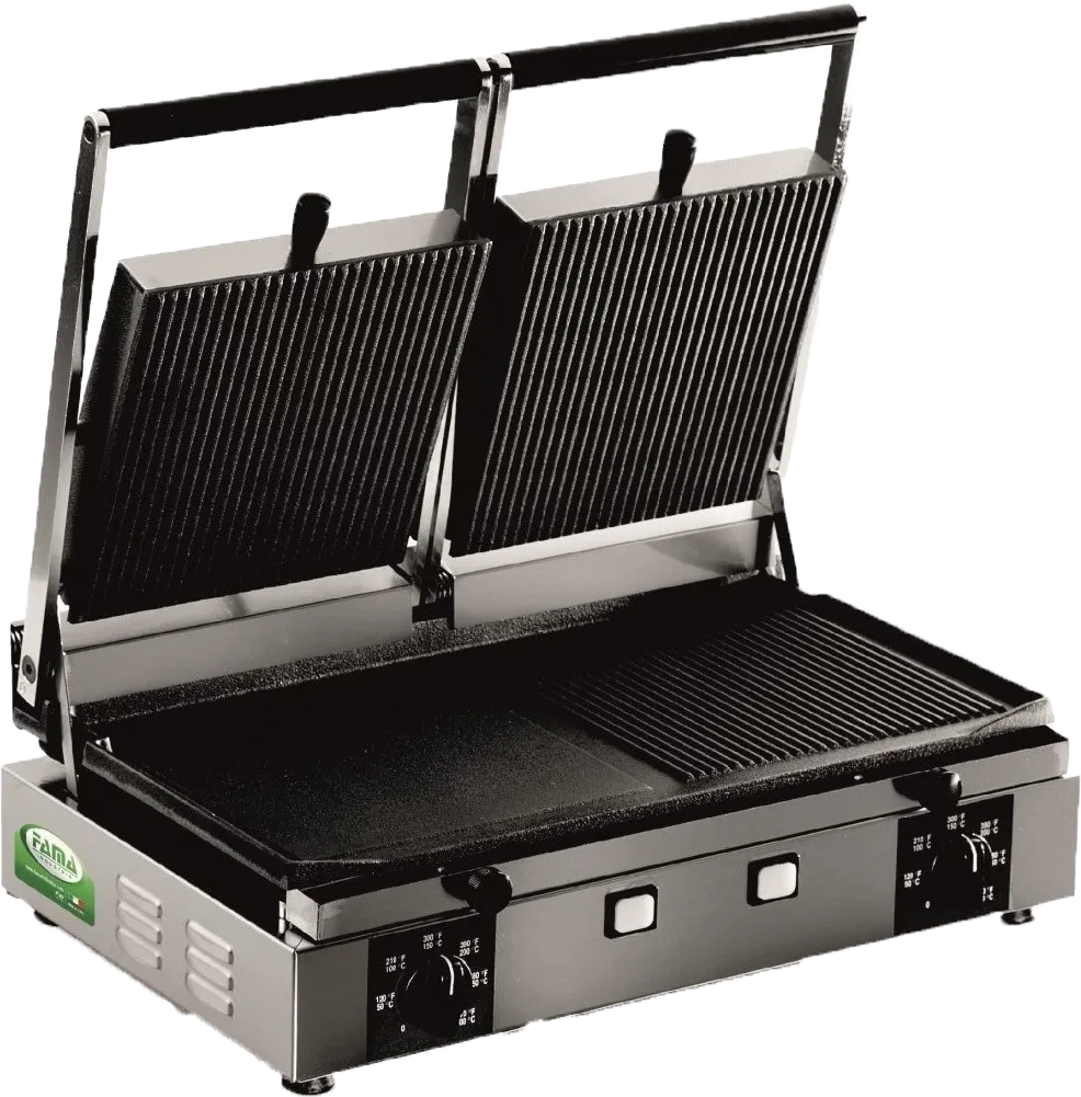 The heavy-duty double contact grill from Fama features cast iron plates with an exceptionally hard-wearing ceramic coating, which is integrated into the iron itself for a longer life. This design not only enhances thermal conductivity but also simplifies cleaning, as residue can be easily wiped away. The grill is equipped with dual temperature controls, allowing products to be cooked at different temperatures on the left and right sides. Additionally, the counter-balanced upper plates and the option of ribbed or smooth surfaces ensure that food is cooked to perfection every time.