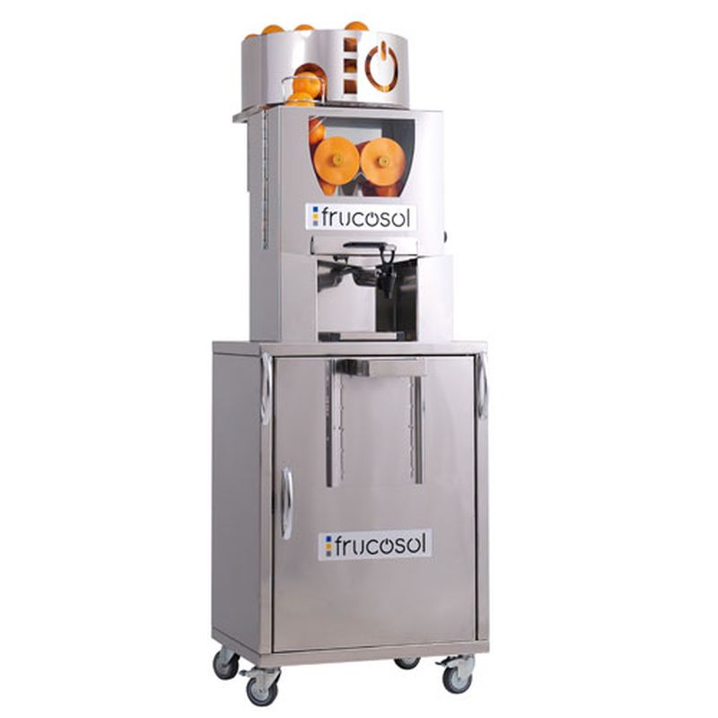 The Frucosol Self Service features an automatic feeding container that can hold up to 50 oranges. The base of the container rotates when in use, automatically feeding all the oranges until it needs refilling. The machine is attached to a stainless steel stand to store the fresh oranges and collect the waste. The wheels make the self-service easy to move around.