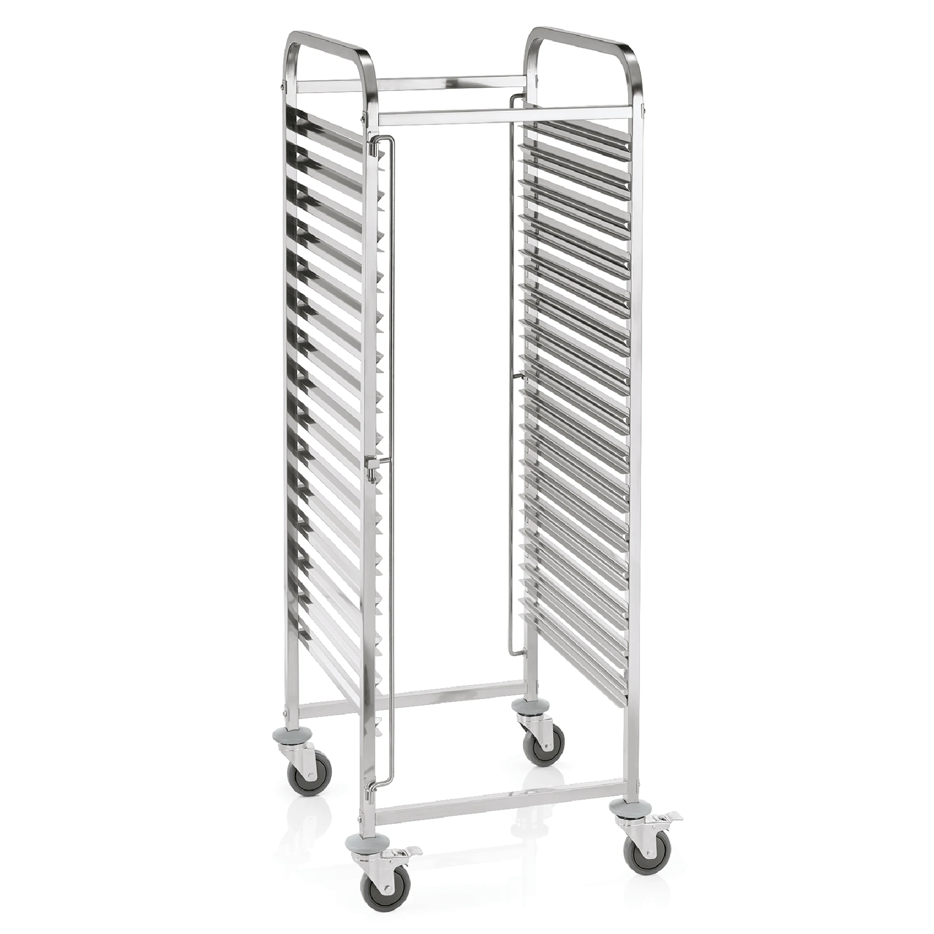 This product is designed to accommodate 15 containers or 30 trays. It features four swivel castors, each with a diameter of 12 cm, and includes bumpers for added protection. Two of the castors are equipped with brakes and a safety catch to prevent the containers or trays from slipping out, ensuring stability and security during use.