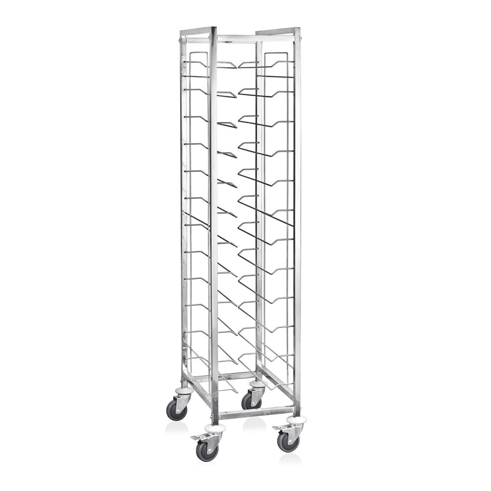 This product is designed to accommodate 12 trays and is equipped with four swivel castors, each with a diameter of 12 cm. The castors include bumpers for added protection, and two of them are fitted with brakes for enhanced stability. Additionally, the product features a safety catch to prevent the containers or trays from slipping out, ensuring secure and reliable usage.