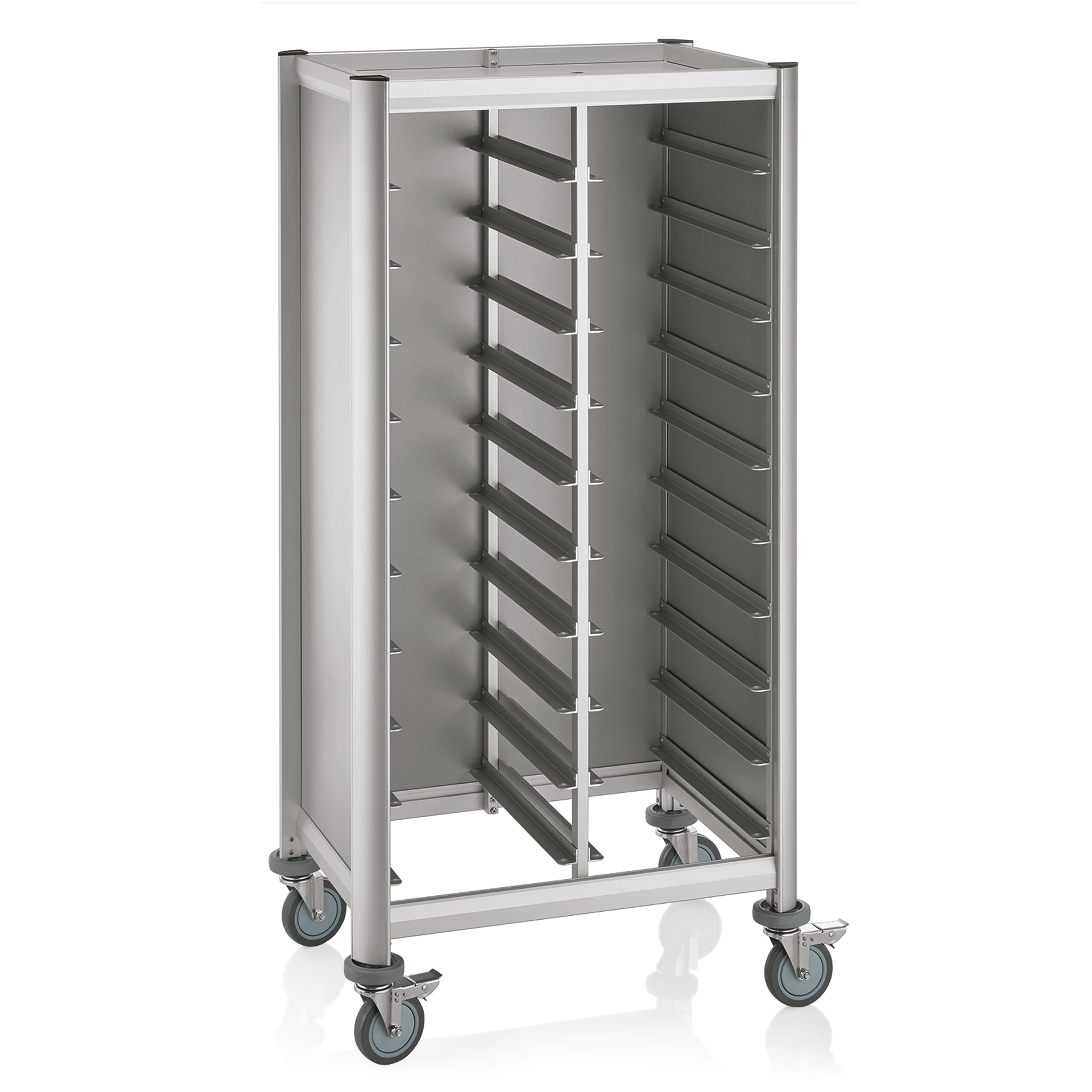 The product features aluminum profiles with MDF side panels, designed to accommodate 2 x 10 trays. It is equipped with four swivel castors, each with a diameter of 12 cm, and includes bumpers for added protection. Two of the castors are fitted with brakes to ensure stability and safety during use.