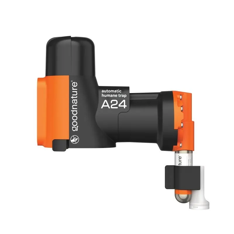 Goodnature A24 humane rat traps are the world's first automatic humane traps. They are small, easy to install, and dispatch rodents humanely and efficiently every time. Attracted by a long-life formula for rats, once triggered, the dispatched pest falls from the trap, which immediately resets itself. The trap is capable of controlling up to 24 rodents per CO2 canister.