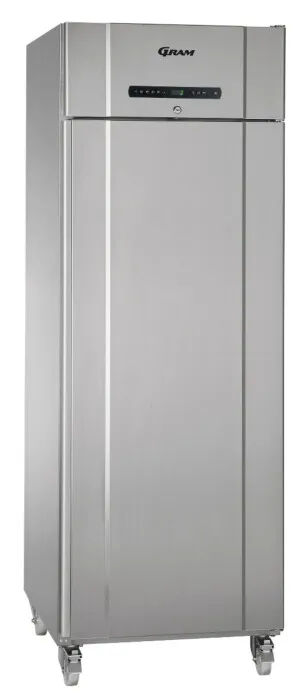 The Gram COMPACT Series Stainless Steel Refrigerator is equipped with a right-handed hinged door. Additionally, this refrigerator features four stainless marine shelves and marine legs, which are not factory fitted.