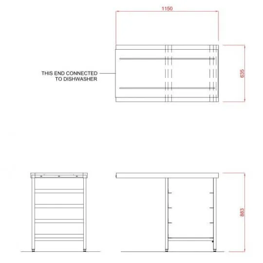 The Hobart SCR1150 Outlet Single Rack Table features welded, high-grade stainless steel tabling.