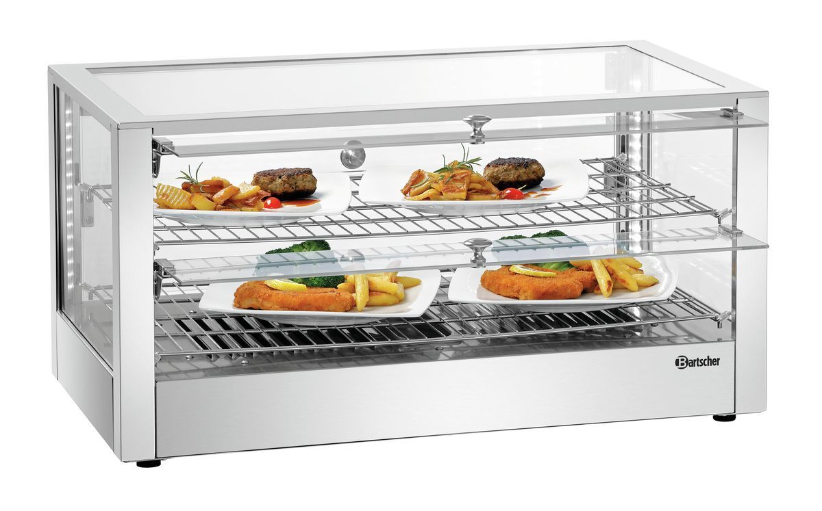 The tabletop unit is designed for dual-sided operation, featuring practical lifting doors for easy access. It is equipped with LED lighting, enhancing visibility and functionality.