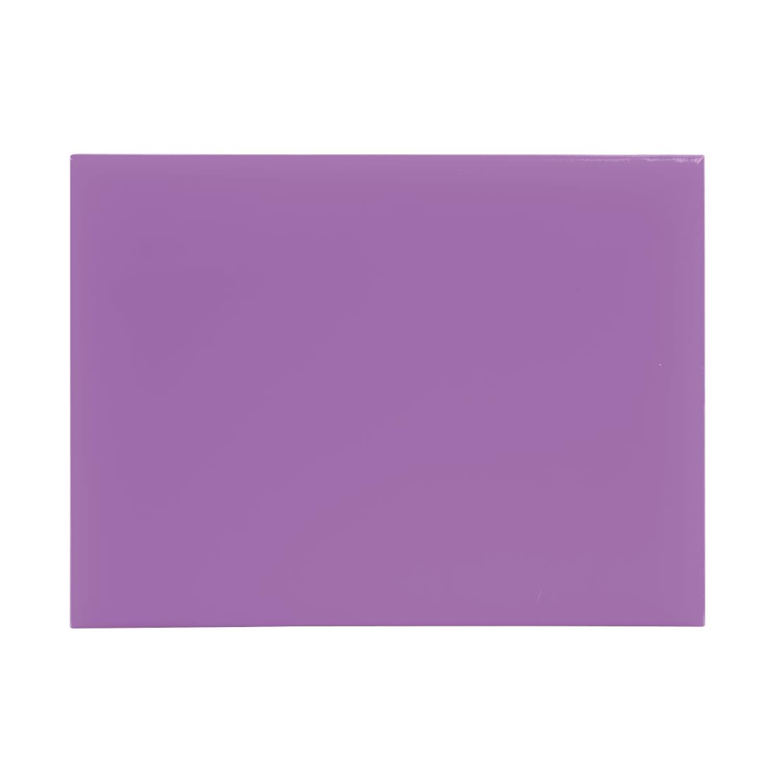 Keep your kitchen organized and hygienic with the Hygiplas high-density chopping board. Color-coded purple for use with allergenic ingredients, the board makes it easy for staff to use the correct equipment for each food type, reducing the risk of cross-contamination. Non-absorbent, non-toxic, and easy to clean, the board helps you to prepare ingredients safely and sanitarily. Made from high-density polyethylene, the board is robust and resistant to scratching, ensuring longevity and saving you money on replacements. Sold singly.