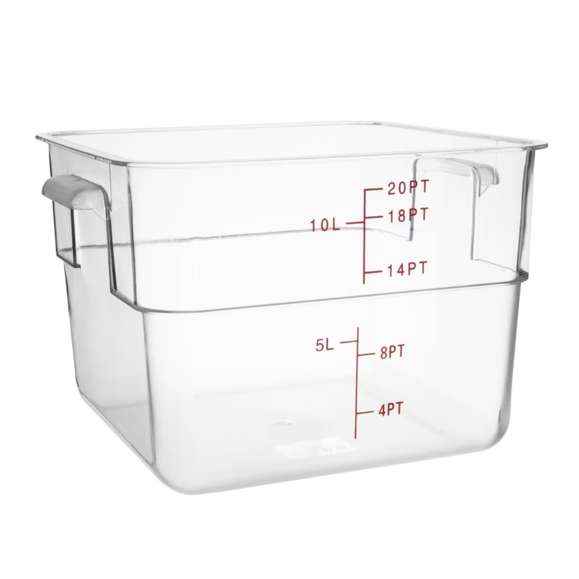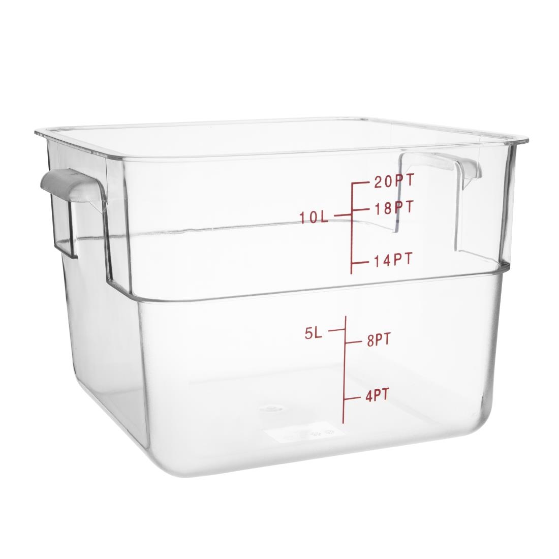 Store your food safely and efficiently with this square storage container from Hygiplas, which has a capacity of 10 liters. These containers are perfect for storing foods like sauces and dressings. Featuring graduated stamped measures, you can accurately measure the amount of food in the container and save time during busy periods. Constructed from strong polycarbonate plastic, the container is very robust and durable to ensure a long life in your kitchen.