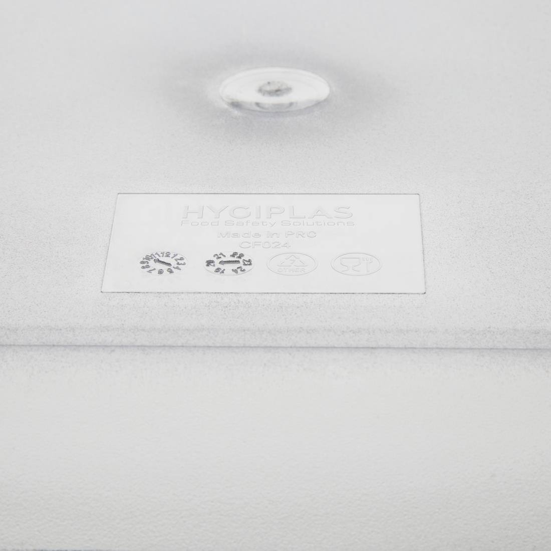 The airtight color-coded lids, sold separately, keep food fresher for longer and allow for quick and easy identification of certain types of food like dairy or fish. The container features a textured bottom for protection against sliding, which reduces the risk of spillages. Additionally, this container is dishwasher, freezer, and microwave safe, making it a versatile piece of kitchen equipment from the leading brand Hygiplas.