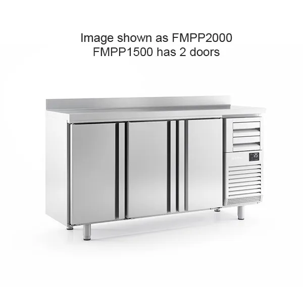 The Infrico FMPP1500 refrigerated counter features a stainless steel finish and is equipped with two solid stainless steel doors. This unit includes two shelves per door, adjustable legs, and a 100mm coved upstand.