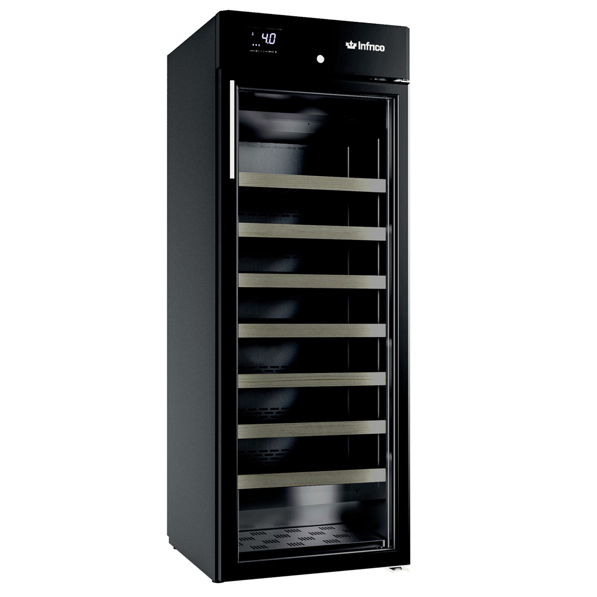 Infrico EVV 70 (EVV70) is a professional wine display case from the EVV Series, listed in Cavas & Dry Aging under Black Lacquered Steel Wine cellars. Built for the front-of-house presentation and sale of red, rosé, white and brut bottles, it helps you hold stock at serving-ready temperatures while keeping the display tidy and secure.